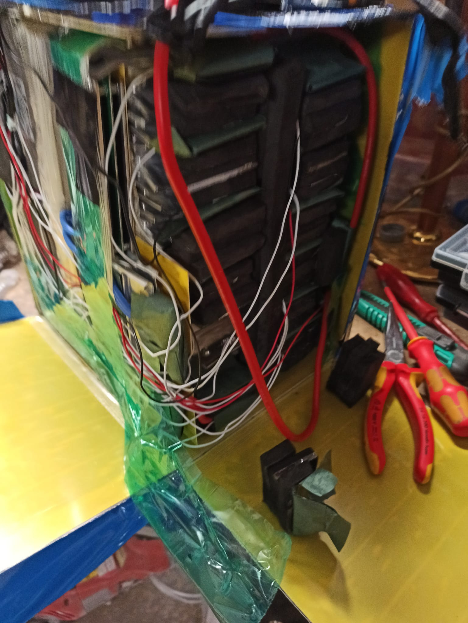 Man sieht die zusammengeschraubten Laschen der Pouches. Das Balancerkabel ist mit einem Lötklecks befestigt...
