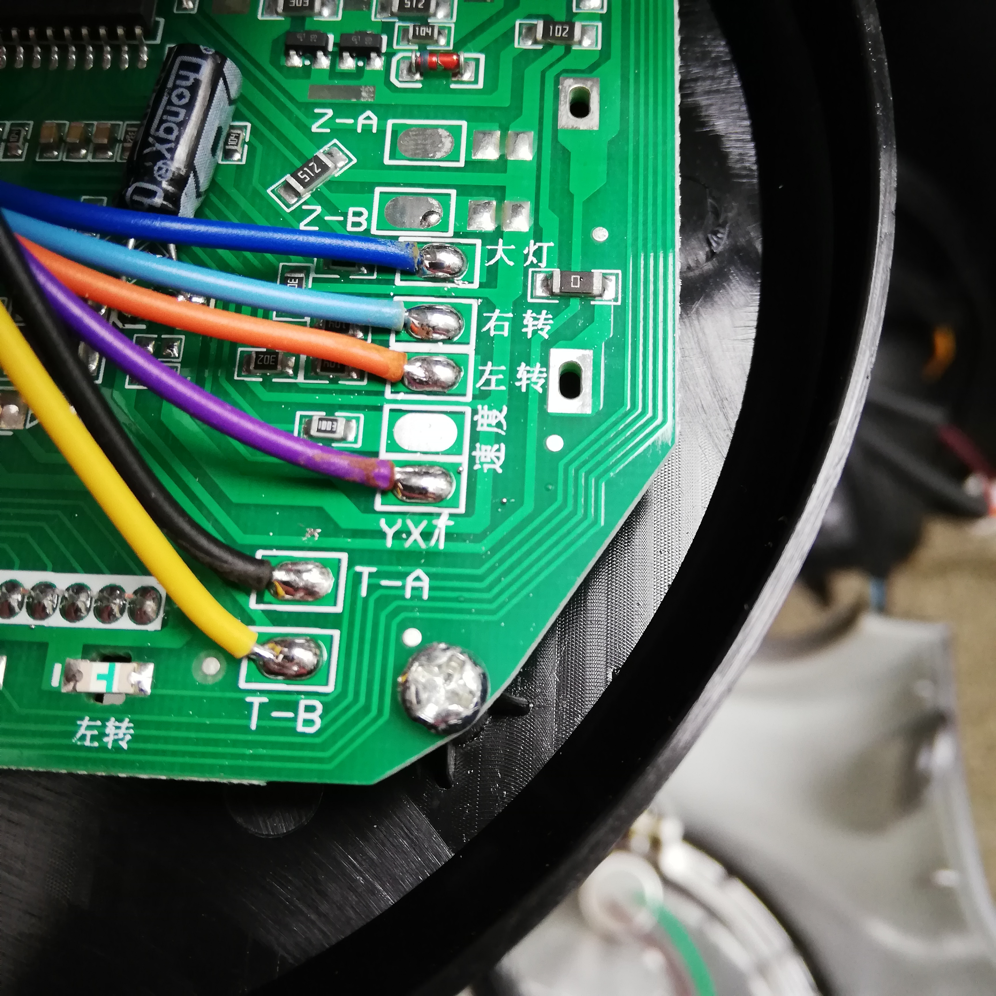 Abblendlicht/Fernlicht von hinten: Verkabelung hinterm Lenker. Oben das Display mit Platine Nahaufnahme Display von vor dem Lenker Displayglas: Platine von innen Wenn ich die Platinenbeschriftung durch Google Translate jage sagt er mir Folgendes für die Adernfarben: