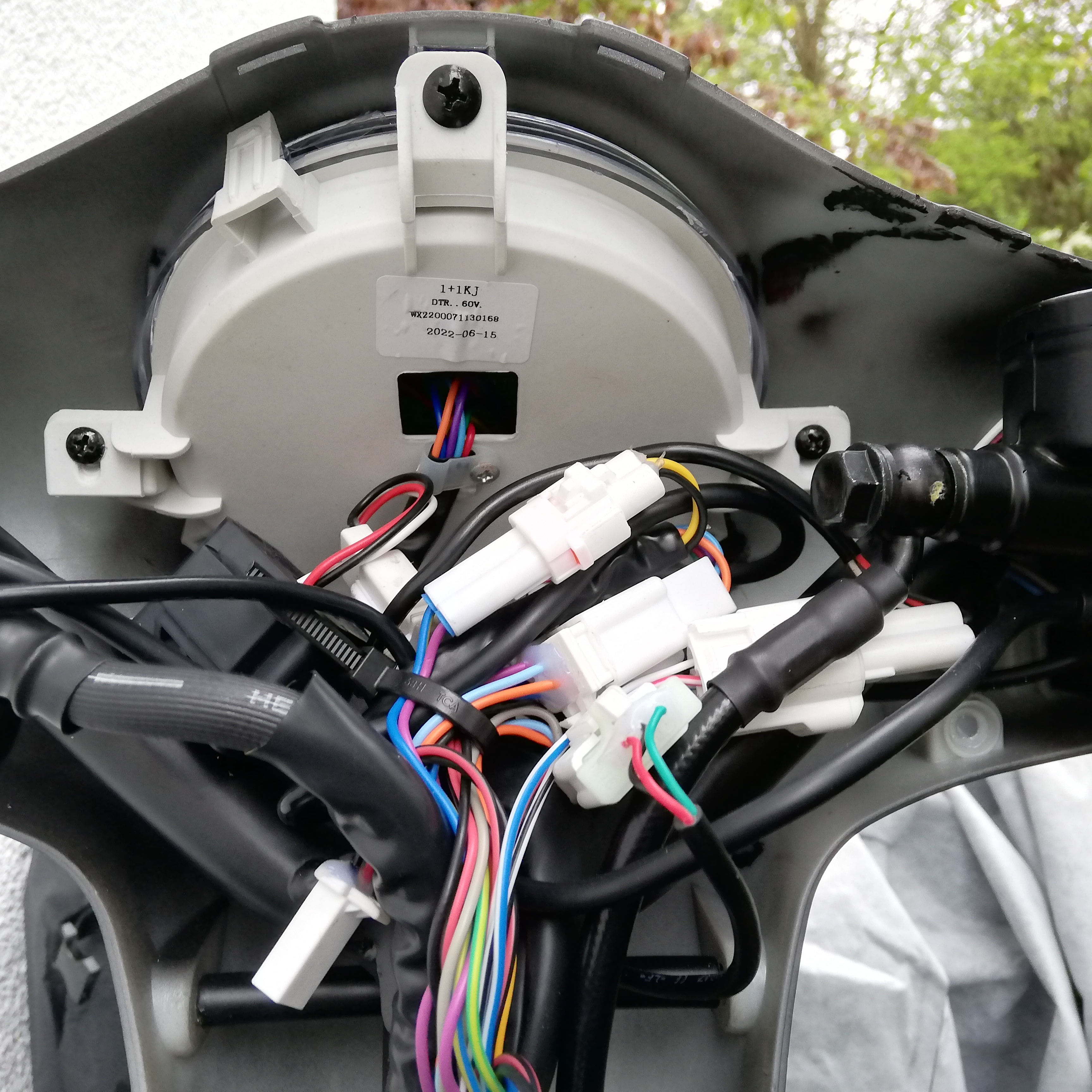 Noch ein paar Fotos, was sich hinter der oberen Lenkerverblendung verbirgt. Man kann dann rausfinden, welche Adern (welche Farbe) zu welchem Schalter etc geht. Das hab ich mir aufgeschrieben. Fotos davon wären sinnlos. Eventuell mach ich noch einen Verdrahtungsplan und schau ob das hinten mit dem FOC Controller passt. Ich hoffe nicht, dass im Fußraum des Rollers noch irgendwelche Verbindungen existieren, wo dann die Adernfarben wechseln. Sonst wird es aussichtslos.