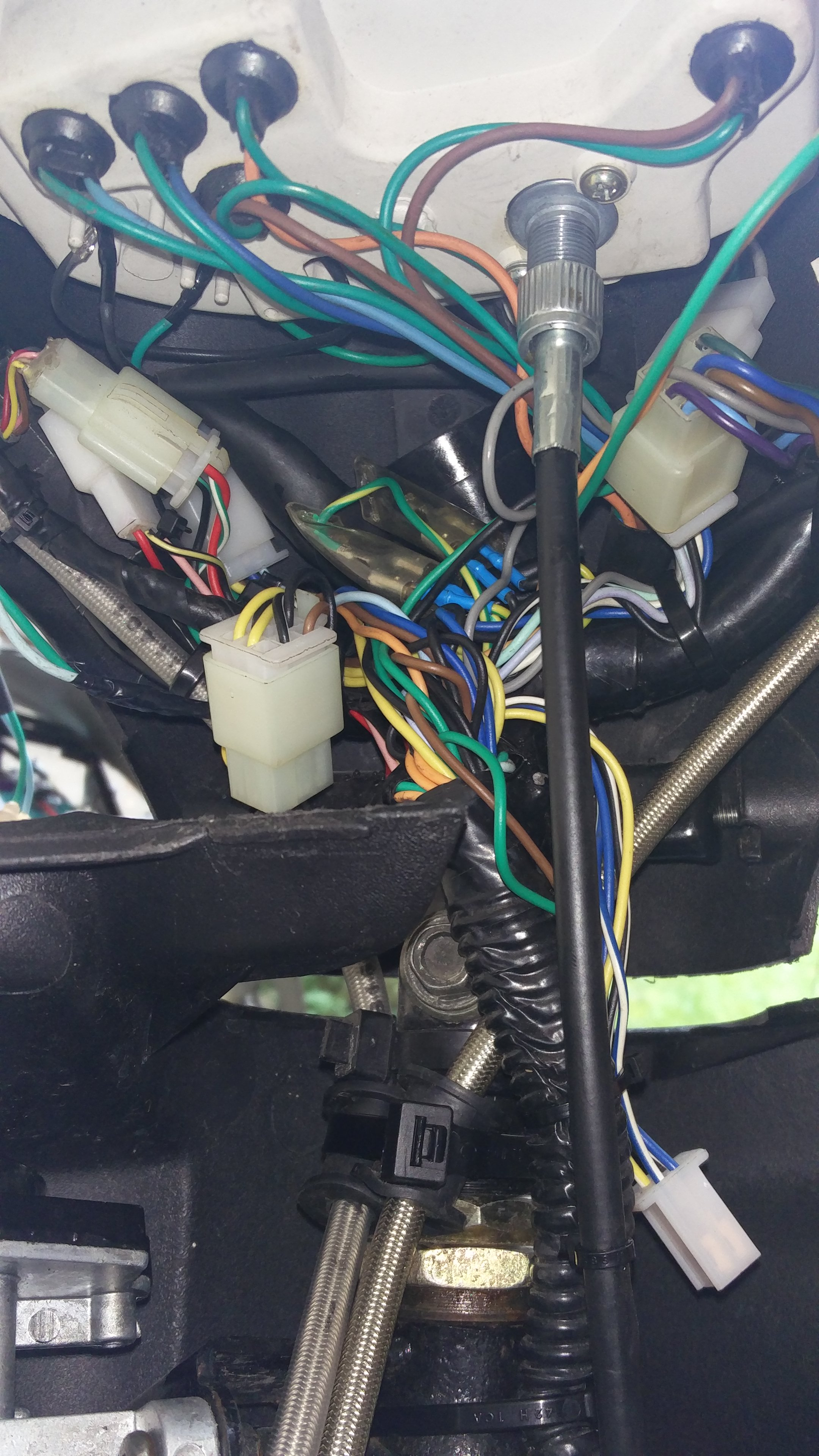 Die ganze Verschaltung spielt sich üblicherweise zwischen den Bedieneinheiten des Lenkers und den zahlreichen Steckverbindungen im Vorbau des Rollers ab. Nach hinten laufen nur die Leitungen für die hinteren Blinker und nach vorn zu den Blinkern ist es ja nah.