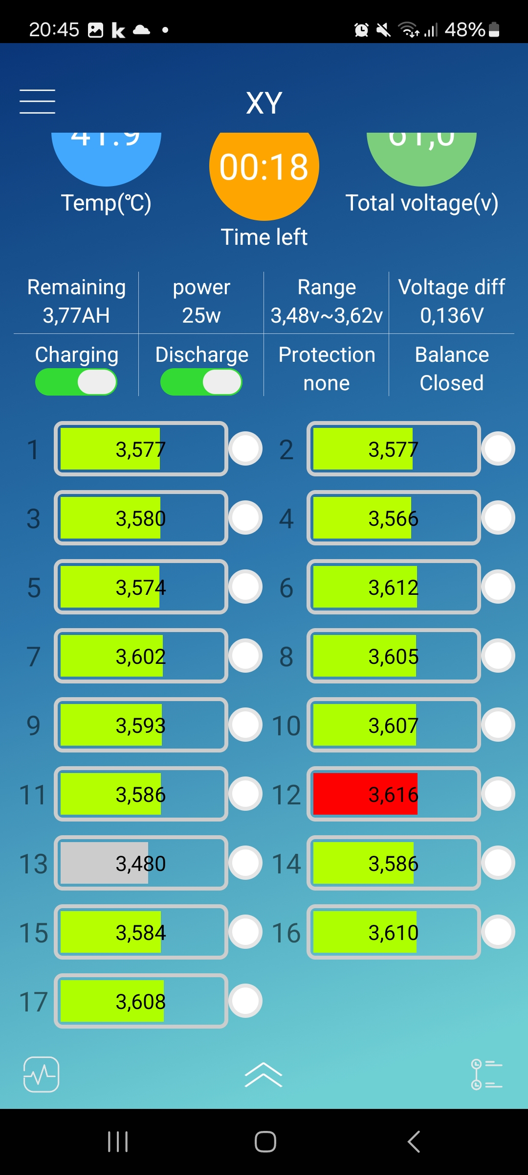 Der Screenshot zeigt den Status nach ca 24km Fahrt. Es ist die Zeile 13, die bei last immer sofort 0,4 bis 0,6V niedriger war als die anderen. Direkt nach dem Laden ist sie gleichauf mit den anderen, pendelt sich aber schnell 0,1-0,2V unter den anderen ein.