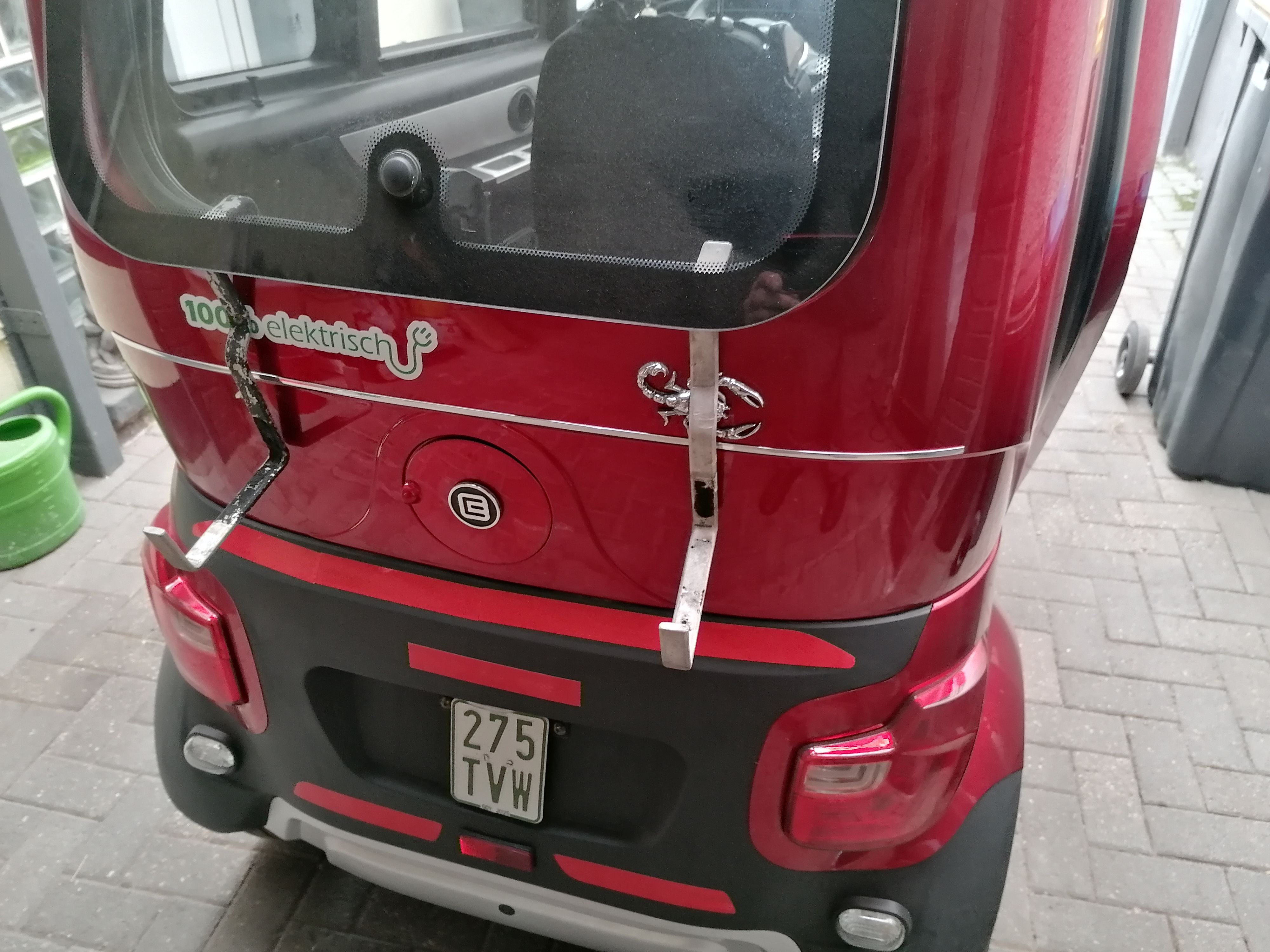 Heute 16.04.25 hatte ich eine Idee wie man eine Packbox hinten anbringen könnte. 2 Haken im geöffneten Heckfenster einhaken und eine Deixelbox passend und abschließbar (hatte leider keine) einhängen. So würde das aussehen, natürlich keinen Balkonkasten mit Geranien. Ob das so erlaubt ist??