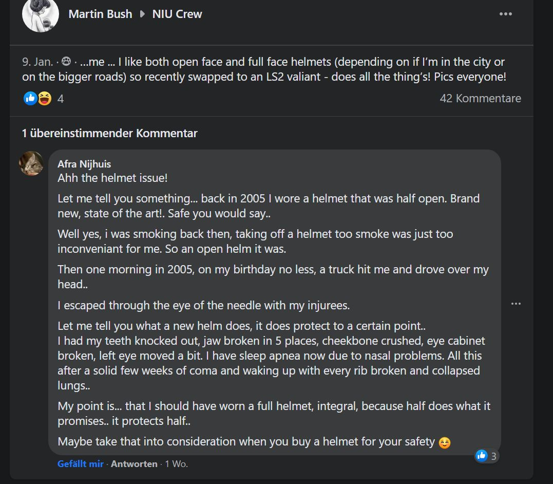 Mit Klapphelm kann man bei "sicheren" Strecken auch mit voll geöffneten Kinnteil wie mit nem Jethelm fahren. Nur Jethelm im Verkehr ist halt recht unsicher, ruck zuck sind die Zähne und Teile des Kiefers und vordere Schädelteile abgerissen oder weggeschmirgelt.