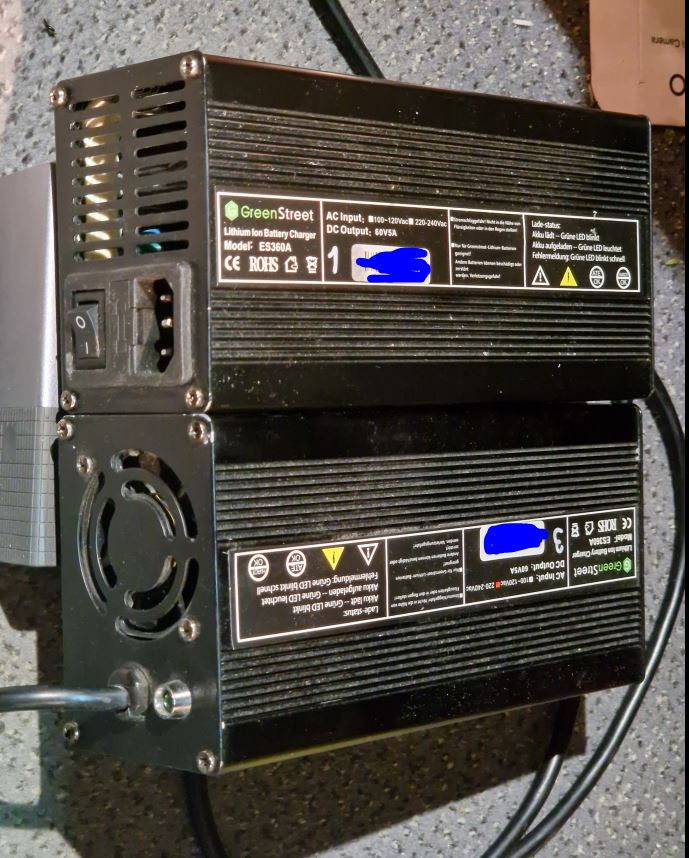 Das Ladegerät hat eine Besonderheit: Es startet mit 100-150W (Netzteileingang, 230V 100-114W in den Akku) Initialleistung je nach Akkuspannung, dann macht es nach 10 Sekunden Klack und es schaltet die 5A mit etwa 366-390V je nach Akkuspannung durch.