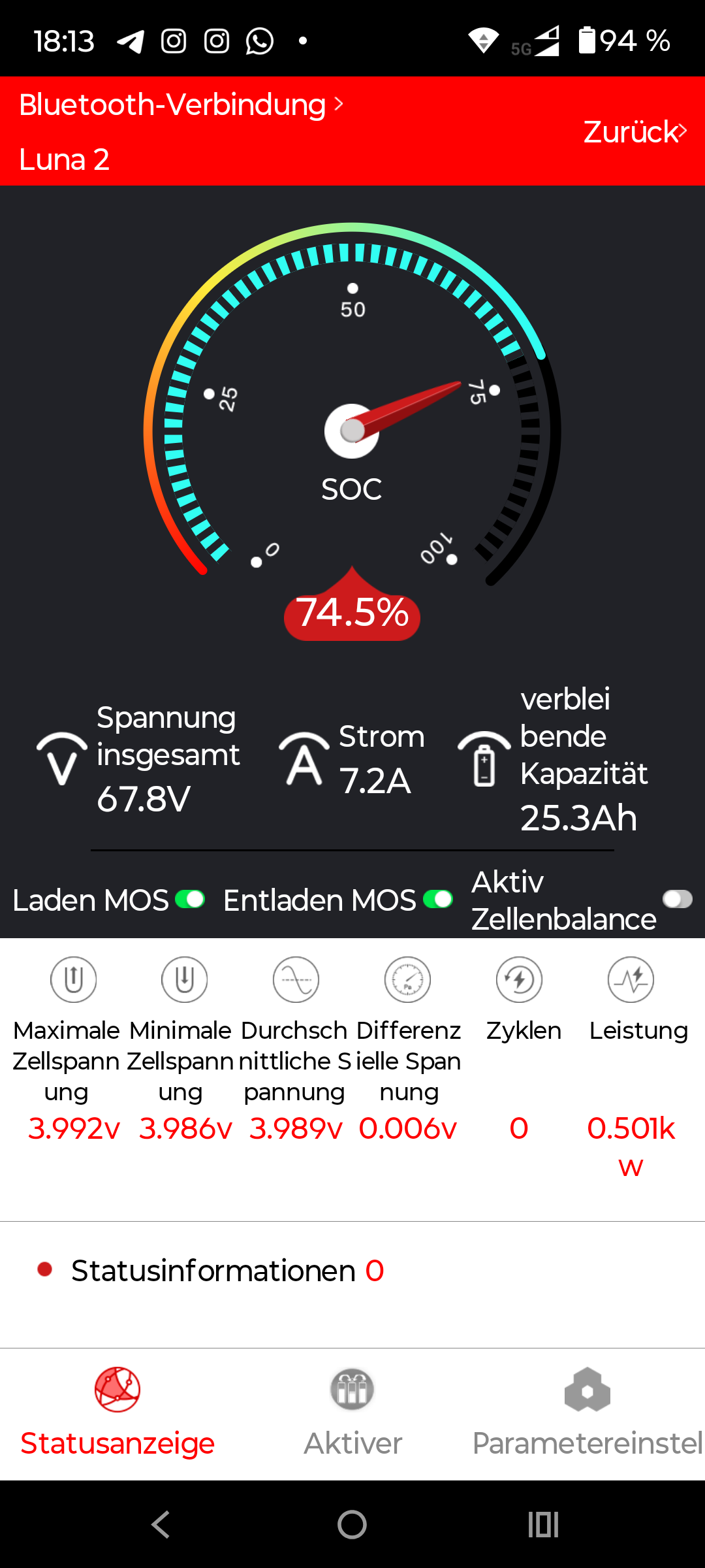 Ich hoffe ich habe dem Moderator nicht zu viel kostbare Zeit vom Sonntag gestohlen, aber wir haben uns ein paar schöne Stunden gemacht. Jetzt ist noch Kommunikation mit dem Controller in Arbeit und etwas Routine mit dem neuen BMS zu erlangen . Beste Option wäre beides Akkus parallel zu sehen oder einfach umzuschalten, mit 2 Handys ist etwas übertrieben