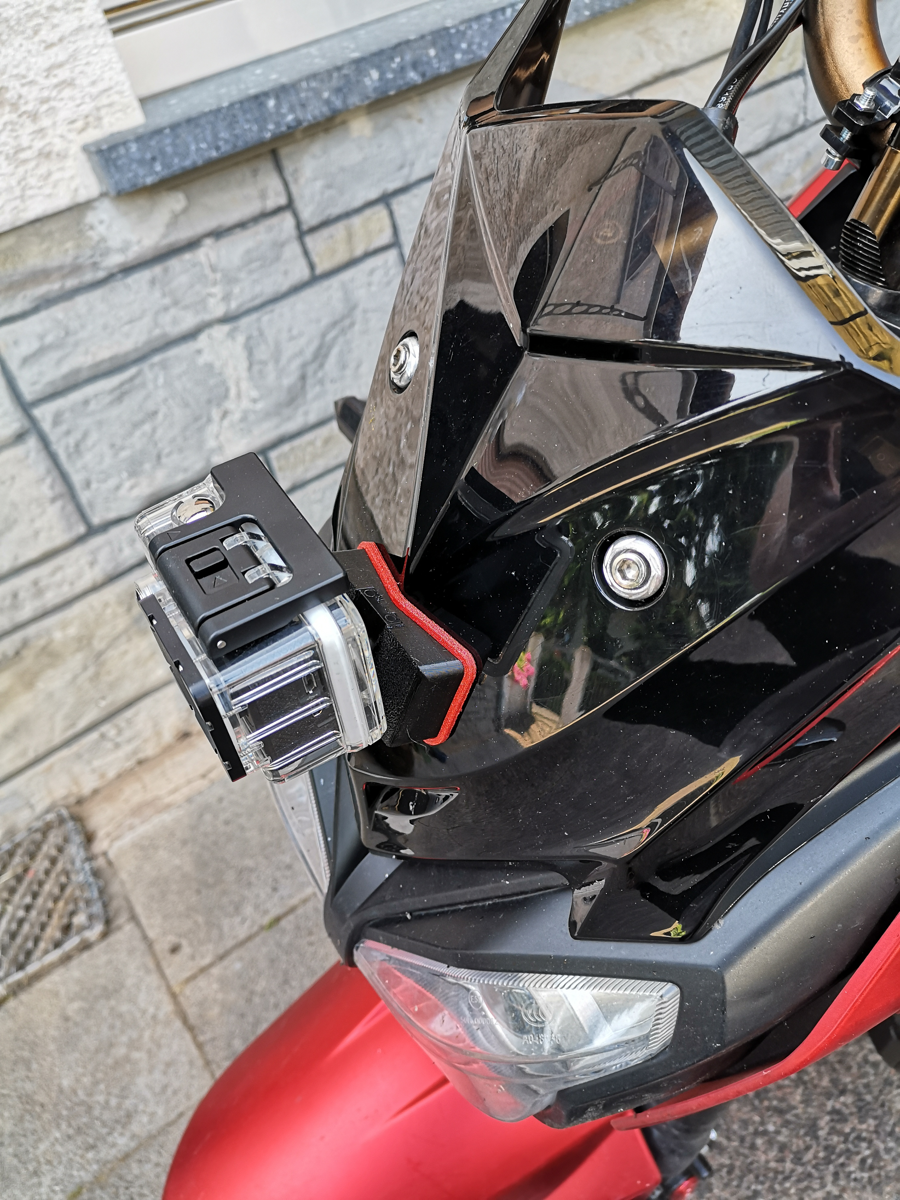 ich hab' am Wochenende mal wieder was nützliches für die E-Odin gebastelt, nämlich eine stabile Halterung für eine Action-Cam, welche direkt vorne am Windschild, anstelle der unteren Schraube, montiert wird.