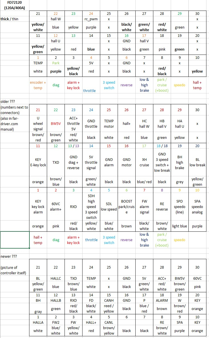 This is colors of actual wiring = our colors (I hope you have same colors). I made it few weeks ago when I was thinking about different controller so I needed to find encoder wires. See that 7 pins is unused ? Yes, some wires splits and go to two connectors but still it makes me believe that those unused pins are for functions that our "custom" controller made for Dayi does not support. This is "wiring definition" that can be found on Aliexpress etc. As you can see, colors are totaly different from ours. And there is only one pin unused (30, do not look at free 22, it is explained in next text). This is wiring pinout from manual downloaded from far-driver.com, totaly different from previous one. Again, colors does not match our colors. What matches is that again only one pin is unused. This is harness picture from manual downloaded from far-driver.com. Check nr. 22, in previous picture it should be blind (no wire) but here it is 5V for diag so I guess it was forgotten to be written into previous picture. I took harness that came with 72680 and it is similar to that tab from Ali (2nd picture) so I made this tab - I followed every wire to the connector and because it is easy to distinguish them I was able to describe every wire in tab. This is wiring pinout of 72680. Hope I did not mistake somewhere but I am pretty sure I did not. I also hope that this tab can help switch some options to correct pin (at least this is how I understand it works - controller can be said to take signal for specific function from specific pin). According my previous tab I corrected numbers of pins in harness picture. If I will not be able make bike work properly by controller settings, there is only one way left - change the wiring.