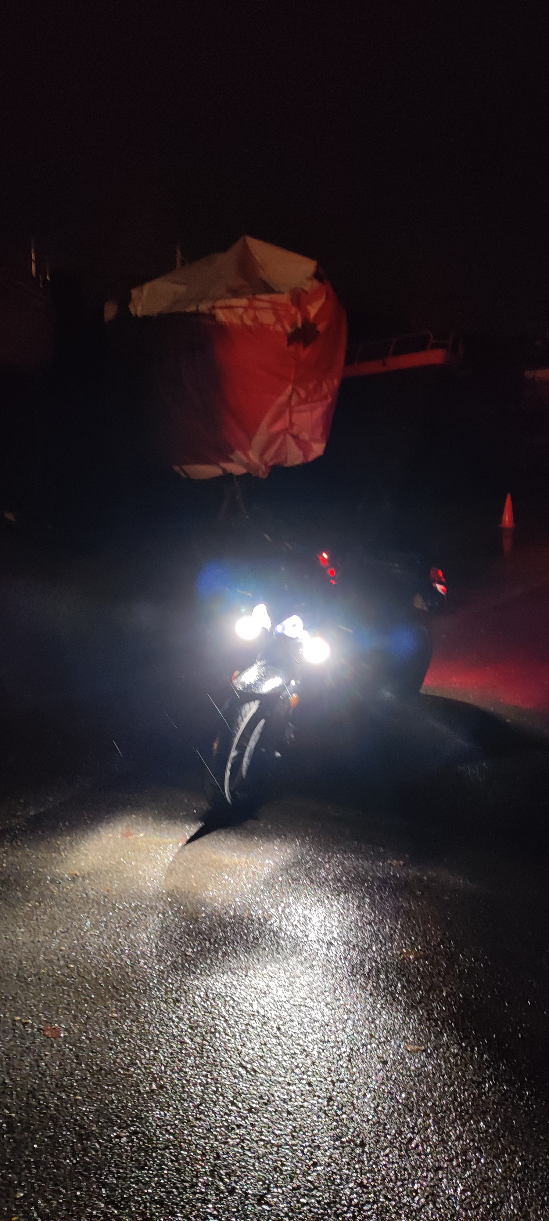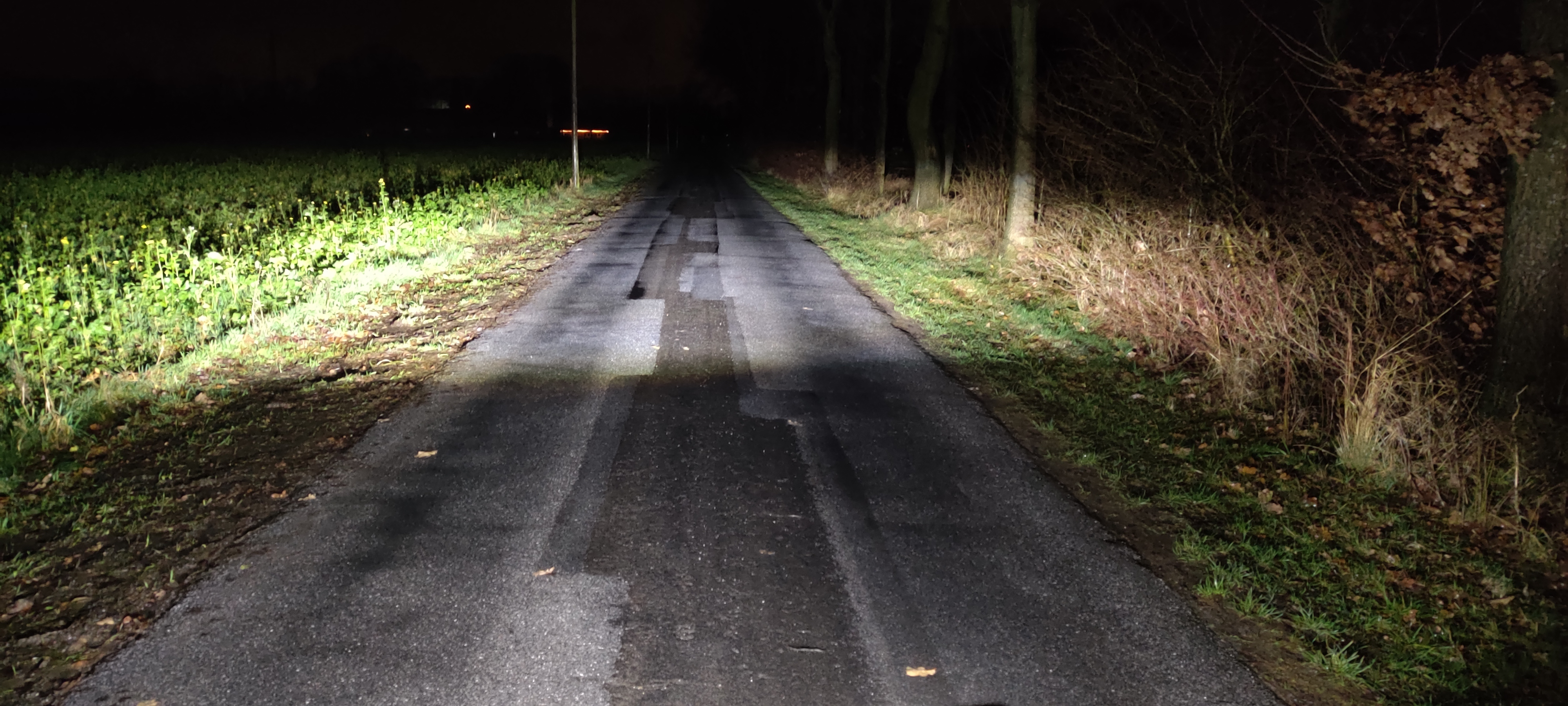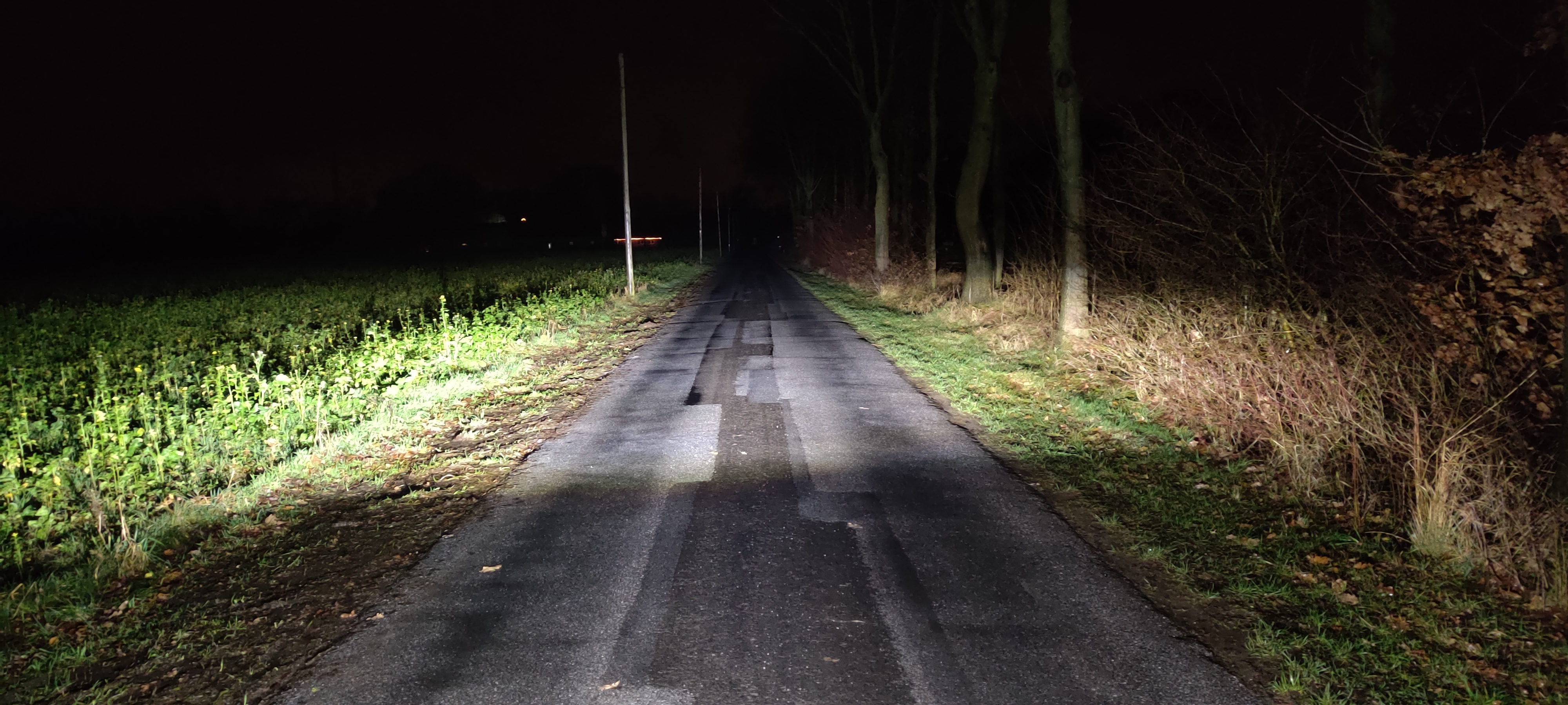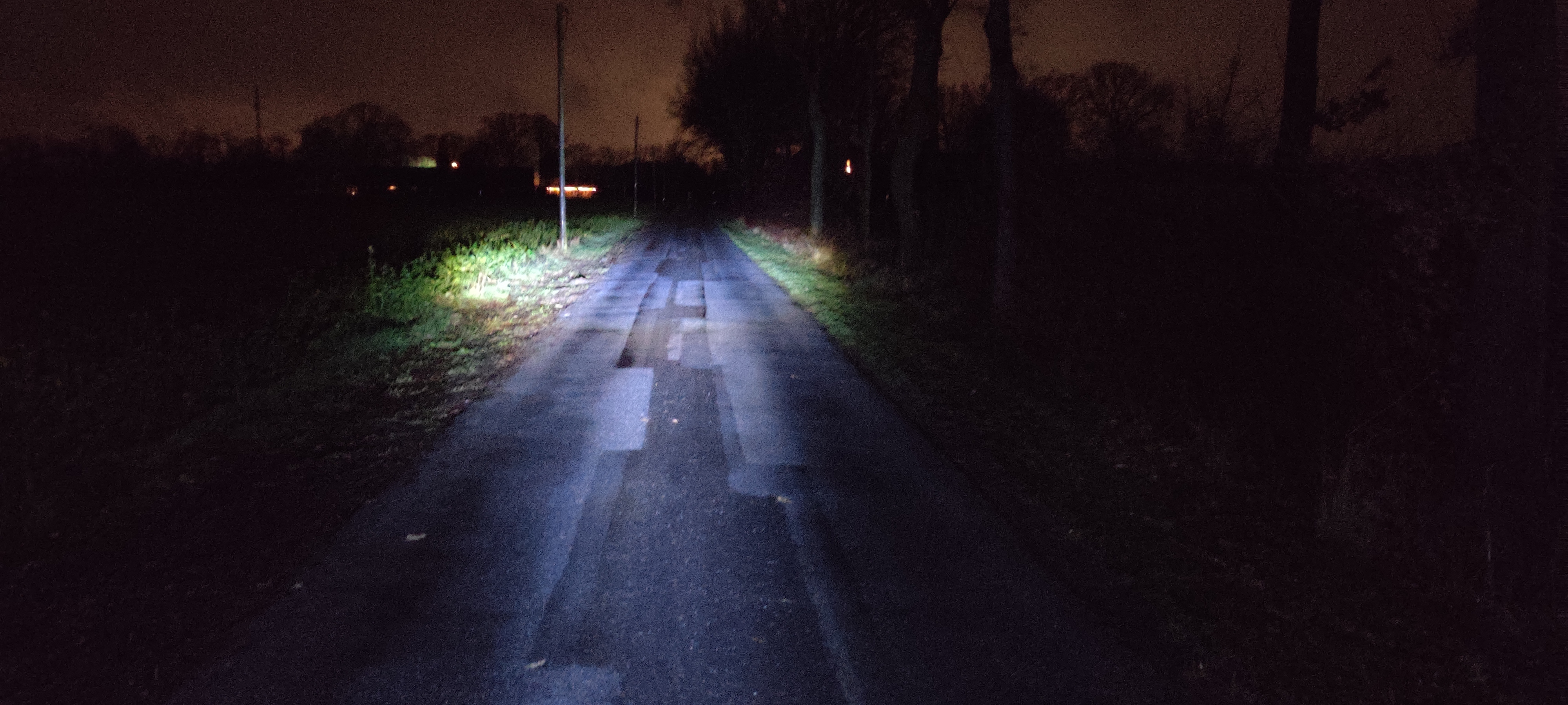 - Der Unterschied ist riesig. Auch hier habe ich Fotos bei Tag und bei Nacht gemacht, aber der Nachtmodus meines Handys belichtet immer fleißig nach, sodass der Unterschied auf den Fotos zwar erkennbar ist, aber in der Realität ist er nochmal deutlich größer. Ich kann diese Zusatzscheinwerfer dringend empfehlen. Die Funzel der Odin ist im Grunde nicht tauglich um damit bei Nacht zu fahren. Mit diesen Zusatzscheinwerfern bin ich sicher unterwegs. Richtig gut!
