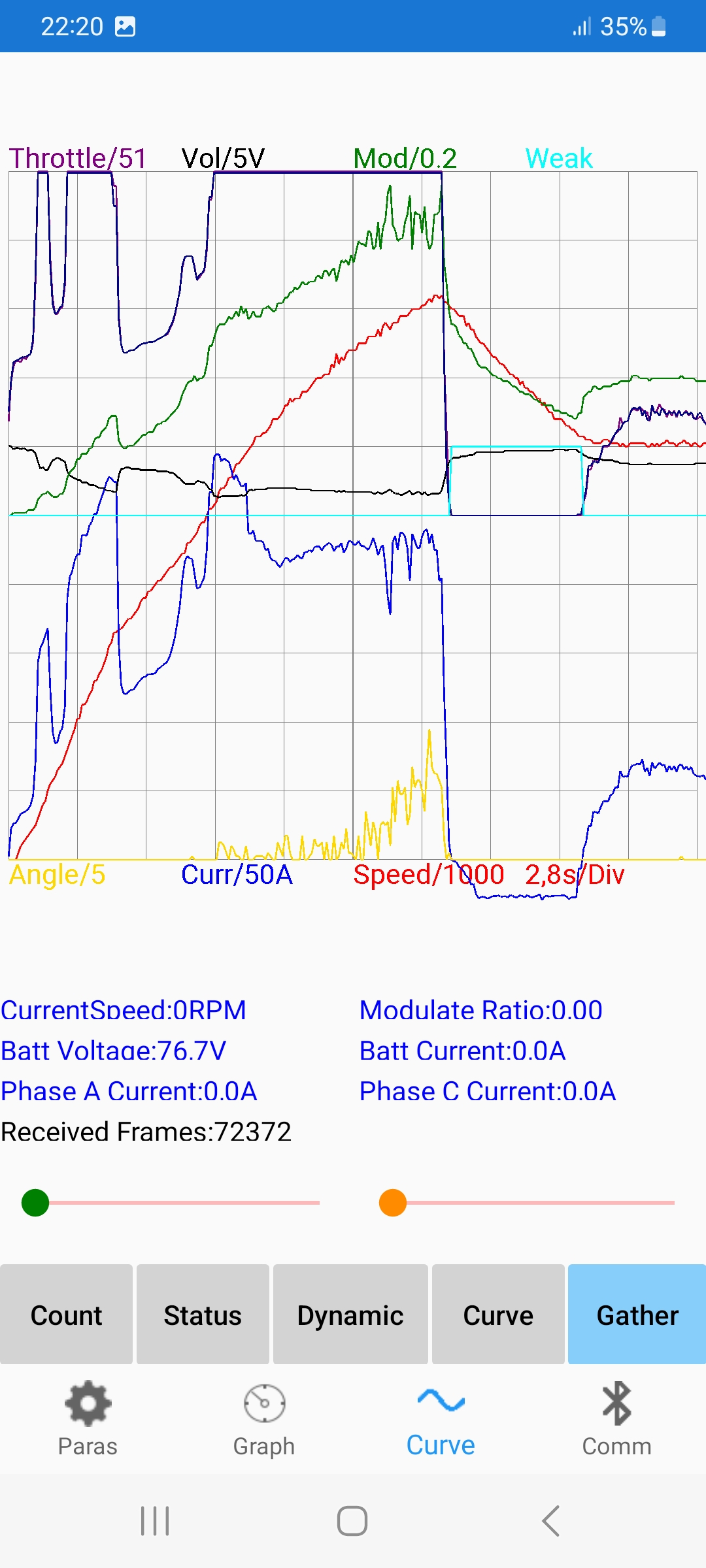 Auch die Feldschwächung kriege ich nicht zum laufen. Er fährt bis 1280U/min mit MTPA und weiter komme ich nicht. Das sind zwar gut 95km/h bei meinem Roller aber mit dem Sabvoton gingen da über 100 mit Feldschwächung.