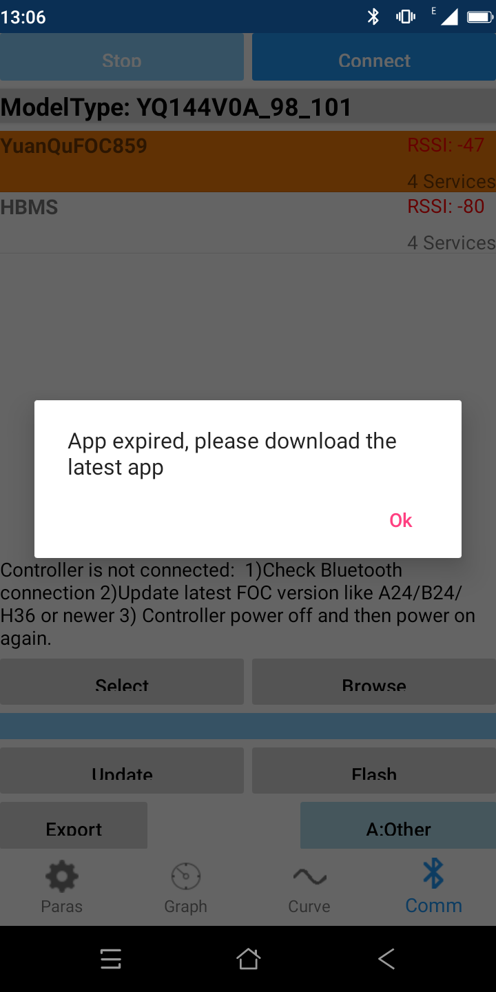Mist, wenn ich versuche eine aktuellere MotornetApp mit dem Controller via Bluetooth zu verbinden bekomme ich: