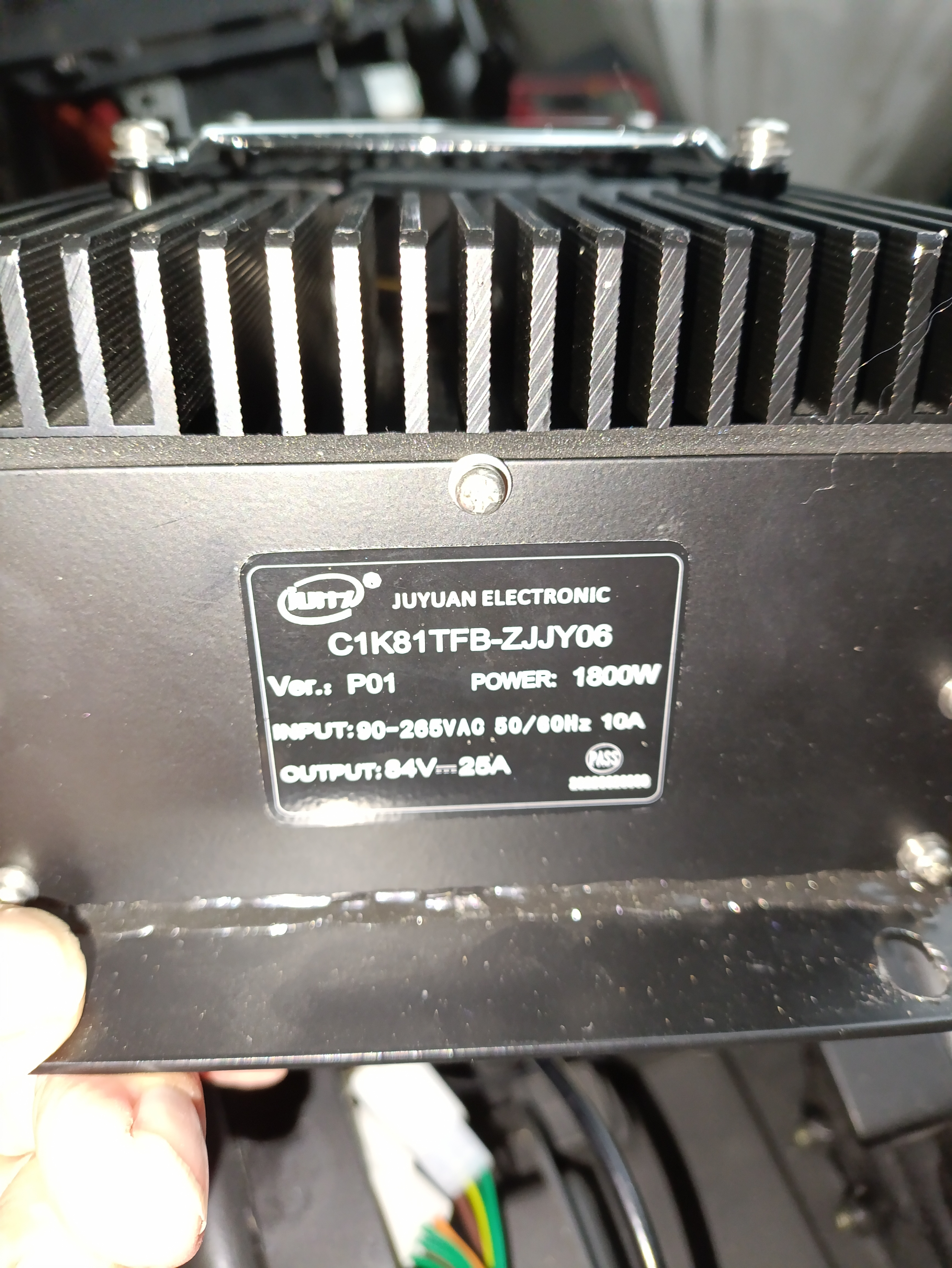 Auf der Halteplatte war oben mit 8er Muttern als Distanzstücke das 25A- onbord- Ladegerät befestigt.