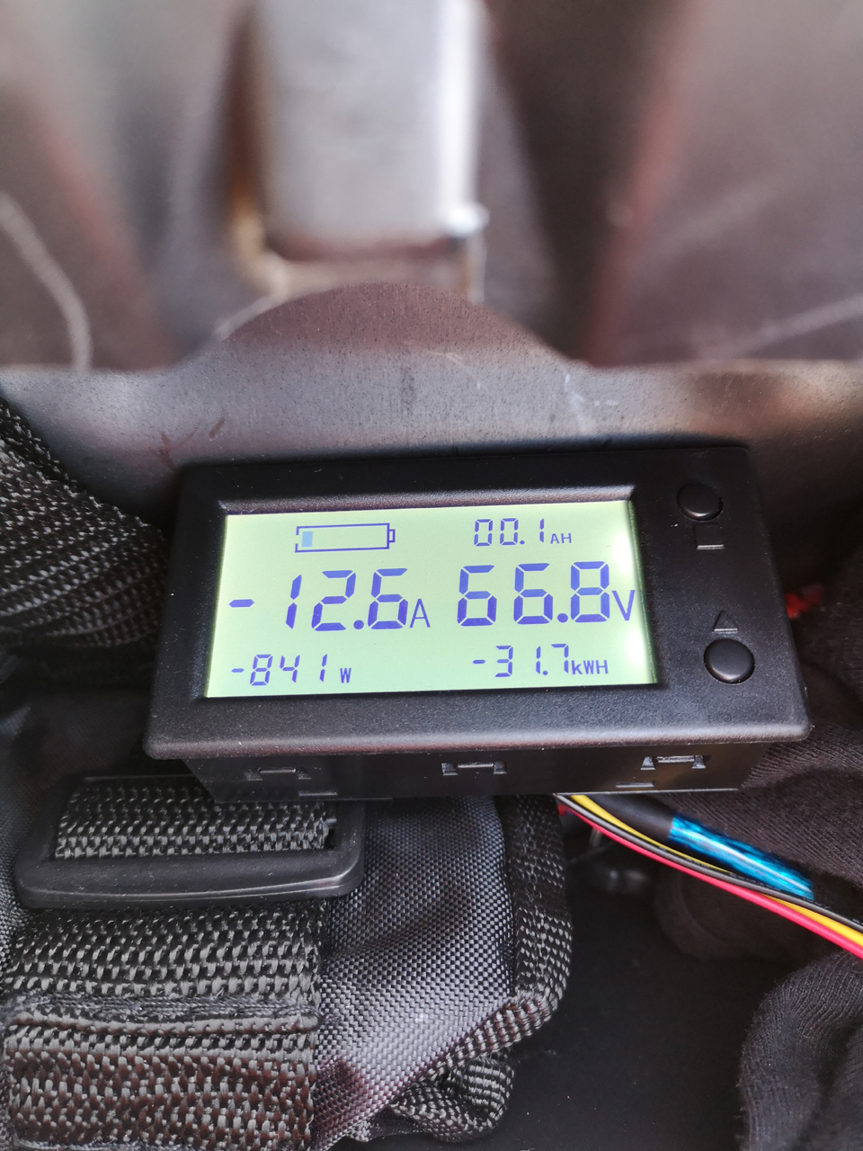 Sofort zeigte das Coulo-Meter den Ladevorgang mit 12,6A und 66,8V an. Der Controller interpretierte die Batteriespannung zu dem Zeitpunkt mit 68,2V.