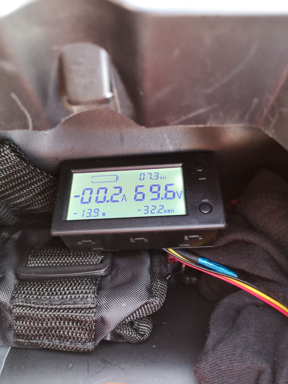Die Spannung vom Coulo-Meter war dann auf 75.1V abgesunken und der Controller dachte sich bei 7 Balken im Display was von 76,4V. Wobei das auf 100Ah eingestellte Coulo-Meter noch 60,9Ah Restkapazität angezeigt hat.