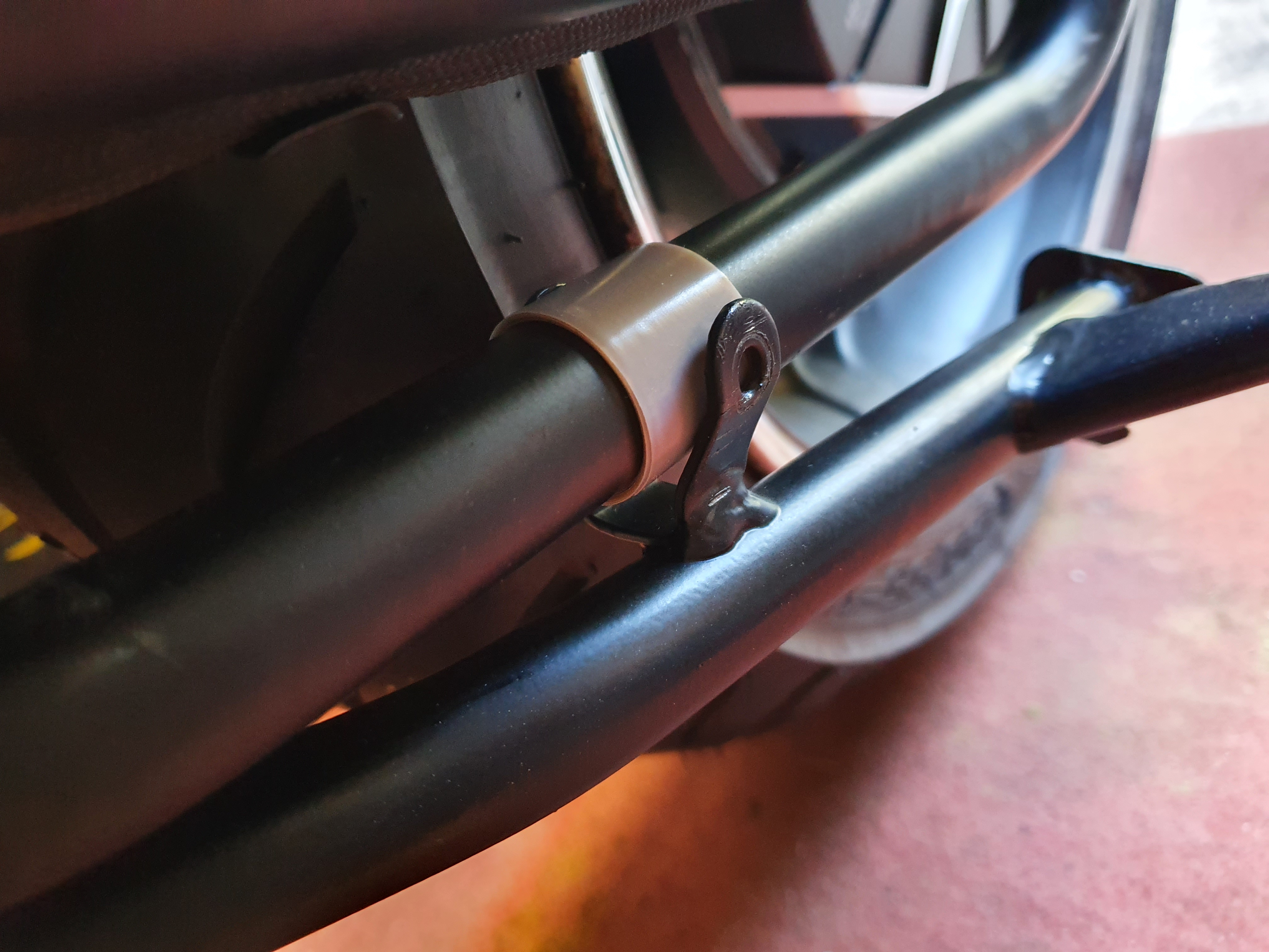 Die Gummirolle hab ich ausgebaut, und die Aufnahme Dieser so rund gebogen, dass sich diese um das Rohr an der Schwinge schmiegt.
