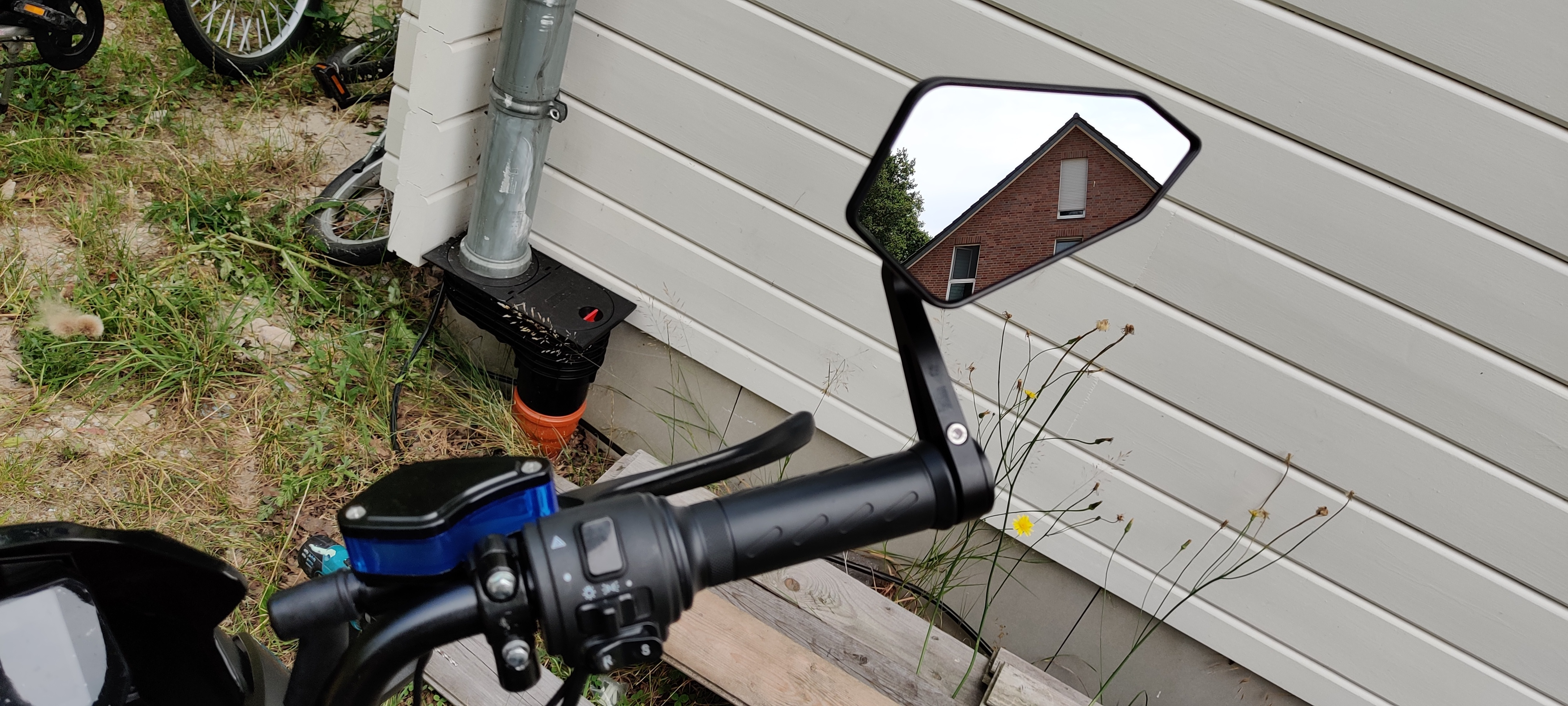 Außerdem nervt mich an den Spiegeln unglaublich, dass sie mit den Bremsen verbunden sind. Wenn ich mir die Position der Bremsen auf eine angenehme und erreichbare Stellung für die Finger einstelle, dann habe ich die Spiegel während der Fahrt im Gesicht. Reingucken ist dann Essig.