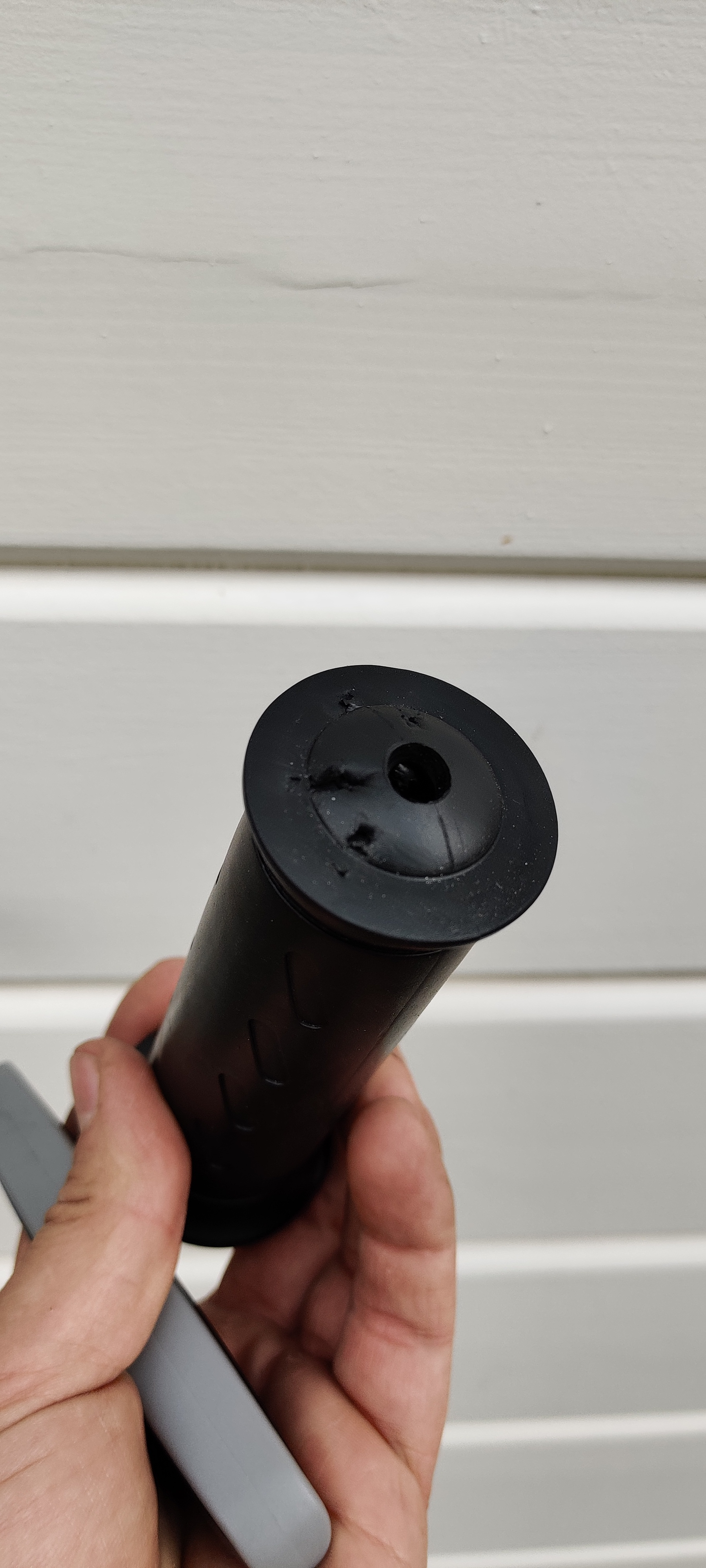 Für die Montage der Lenkerendspiegel muss dann zunächst das Griffgummi am äußeren ende aufgeschnitten werden. Anschließend kann das Griffstück wieder aufgeschoben werden. Spannenderweise war der Griff bei mir nicht ganz auf den Lenker geschoben. Direkt hinter dem Griffgummi befinden sich ja aber die Schaltereinheiten rechts und links. Diese sind im Lenker mit einer Bohrung verbunden, damit sie sich nicht auf/abwärts bewegen und mitdrehen, beispielsweise beim Gas-geben. Wenn man jetzt die Lenkerendspiegel von außen auf den Lenker setzt, dann müssen diese ganz anliegen damit sie befestigt werden können. Die Griffgummis rutschen dadurch etwas weiter auf den Lenker, die Schalteinheiten müssen ebenfalls etwas weiter nach innen rutschen und: Die Bohrungen passen nicht mehr. Hier müssen also neue Bohrungen gesetzt werden, damit die Schalteinheiten wieder passen. (Etwa 1-2cm nach innen)