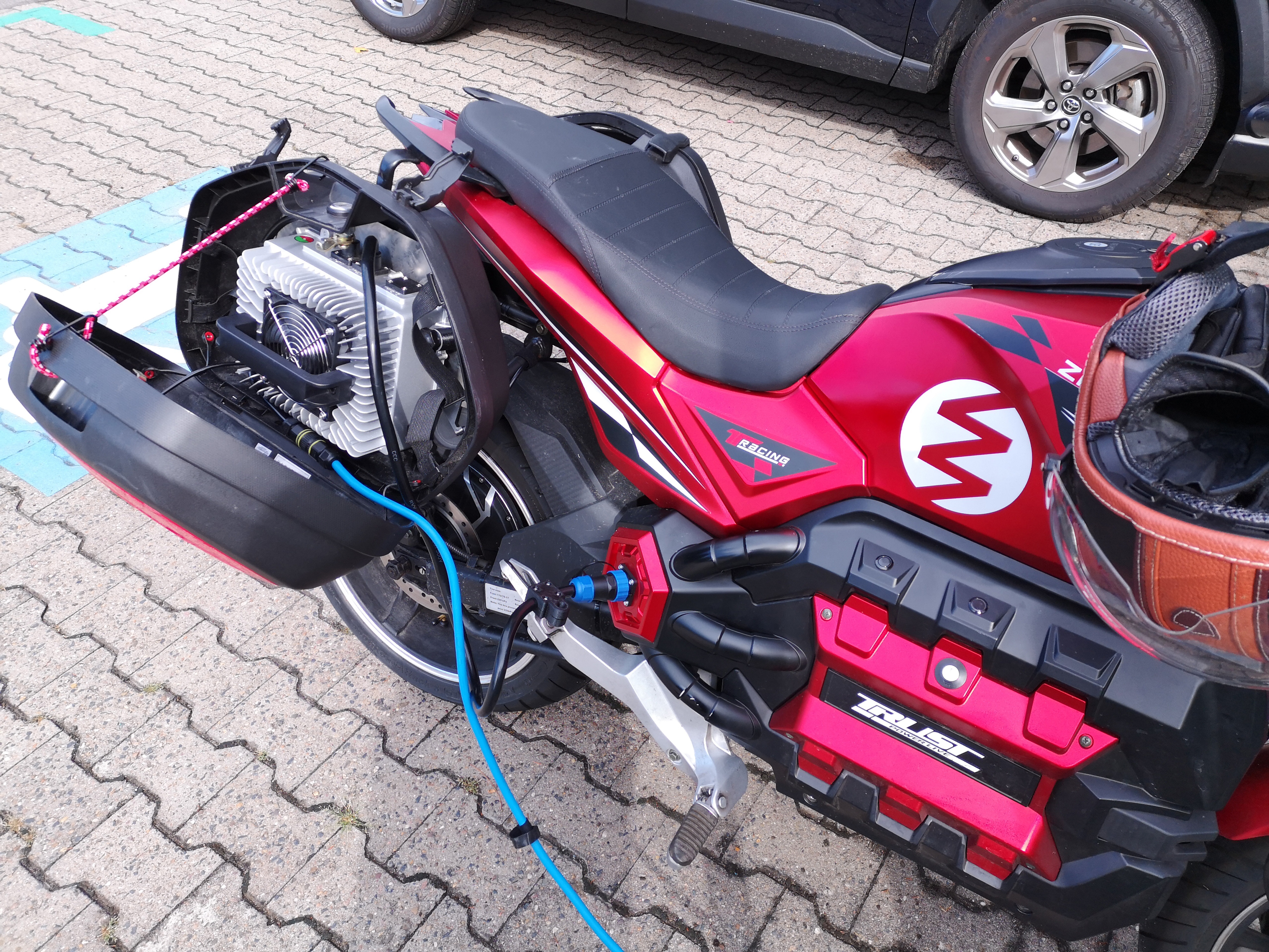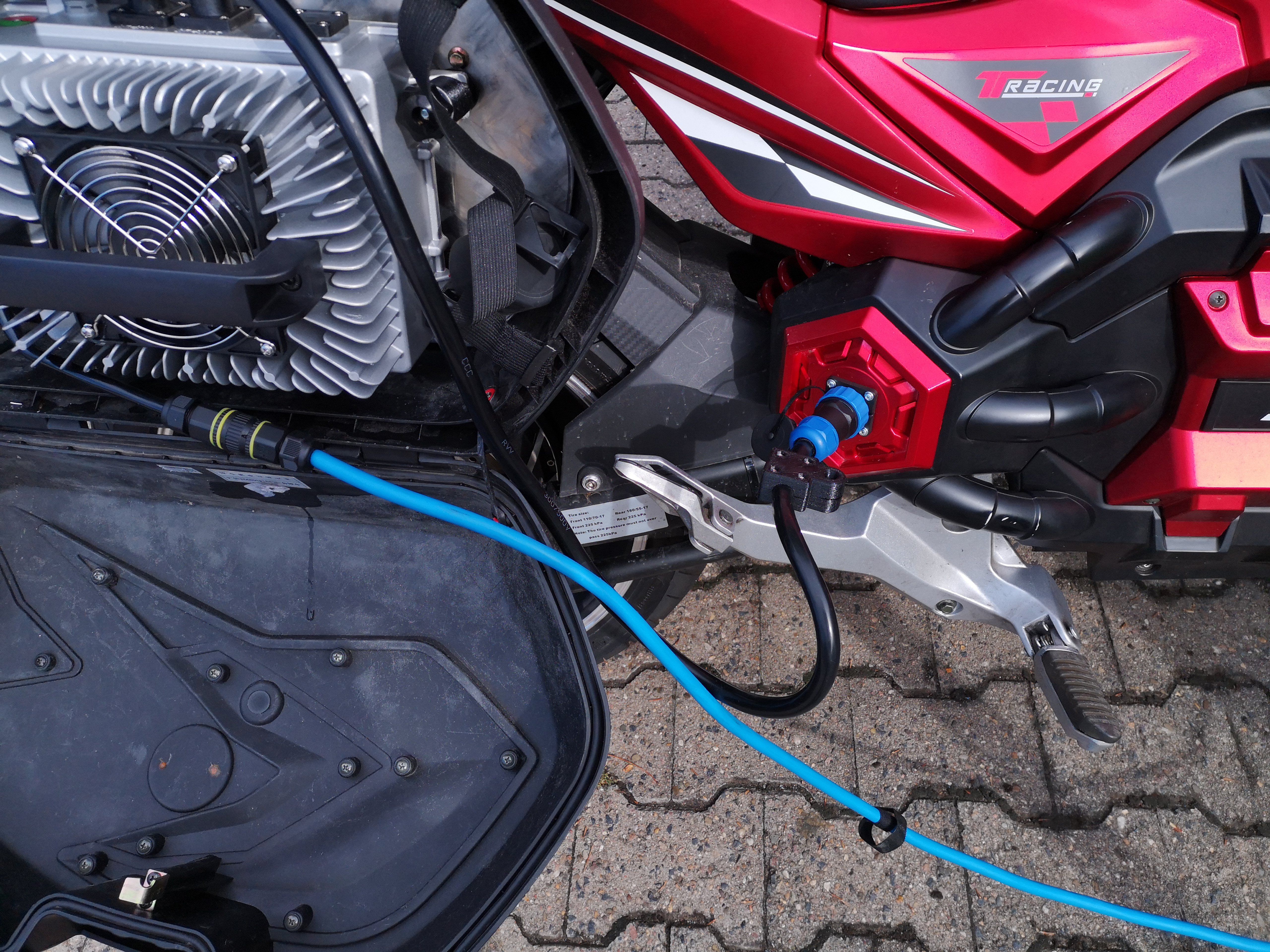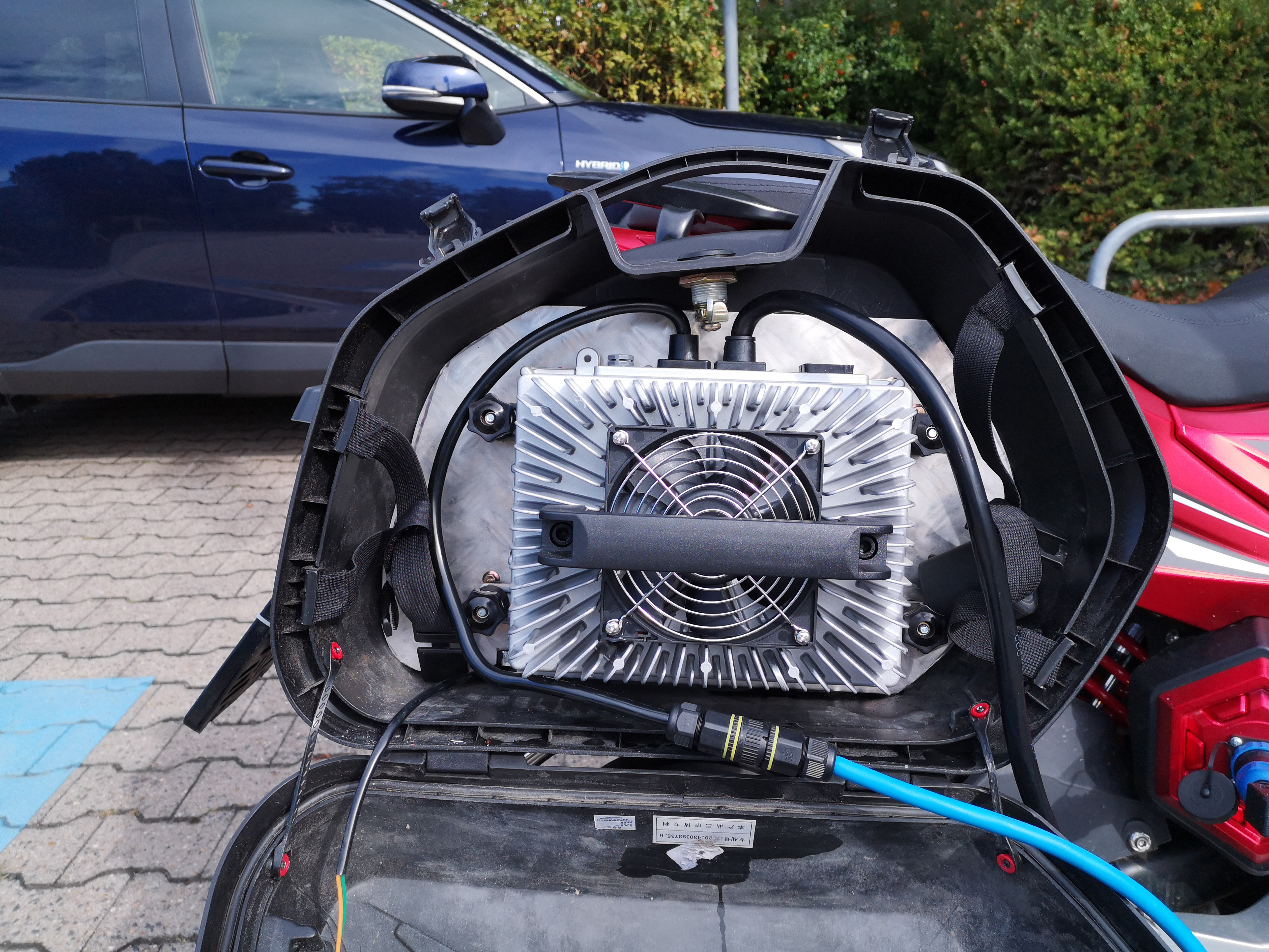 Daher habe ich mir in China ein IP67 Ladegerät mit 84V/40A bestellt und es in den rechten Seitenkoffer eingebaut, also ganz in der Nähe von meinem zusätzlichen SP28/IP68 Ladeanschluss.