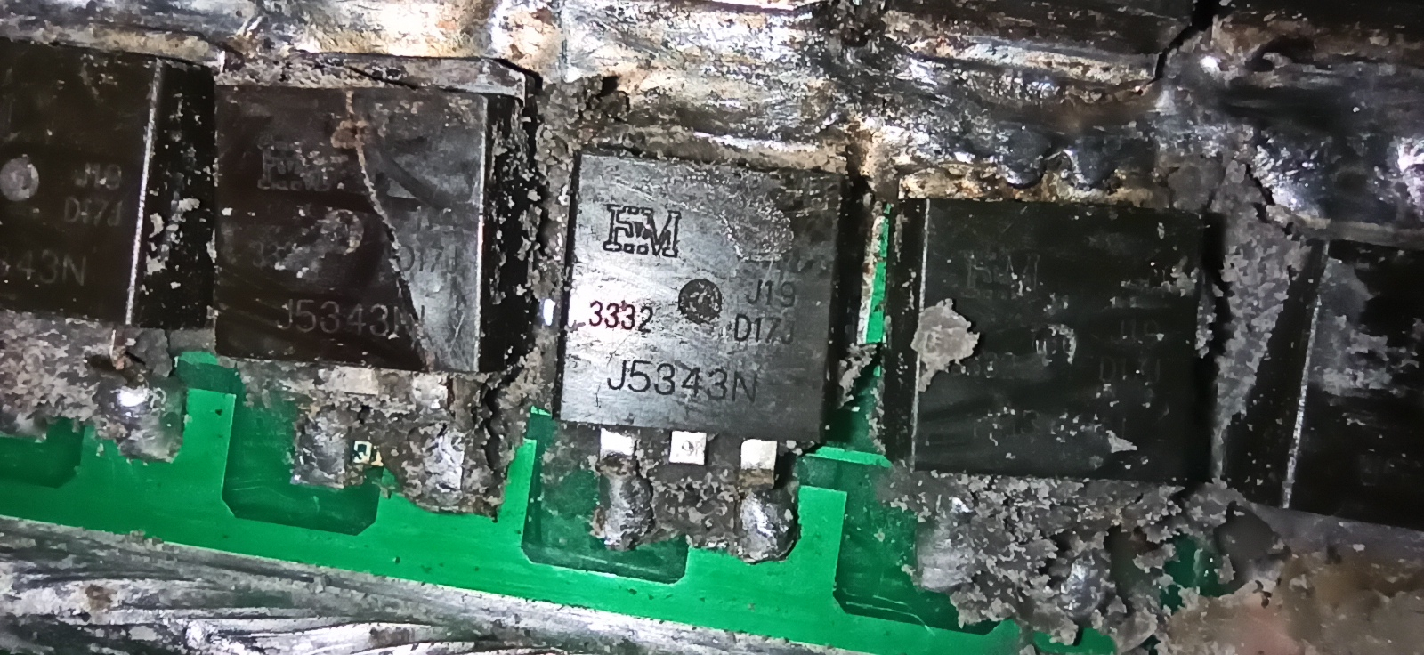 You have bridged the FETs with solder over the traces between source and drain. So it may work with no or little load.