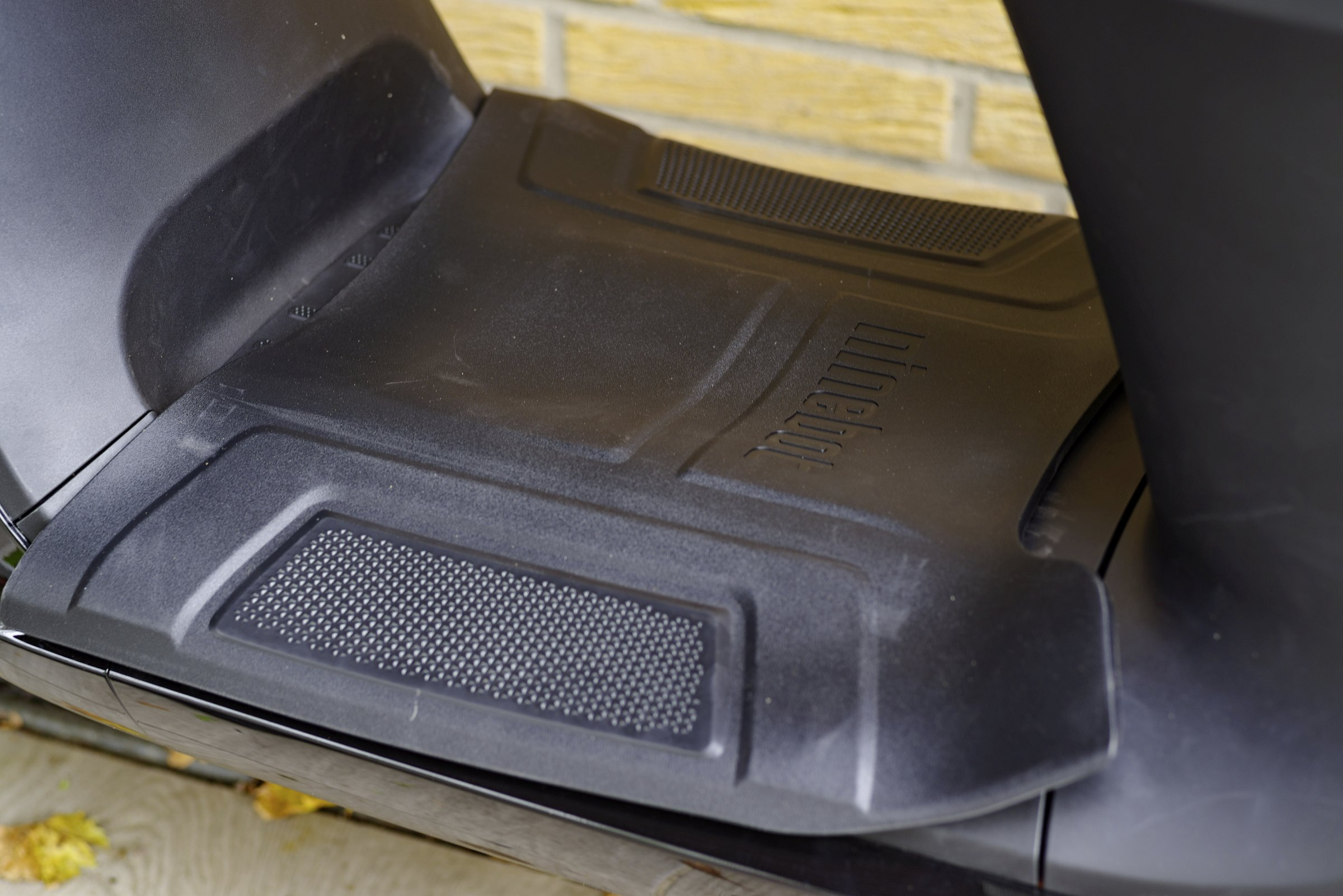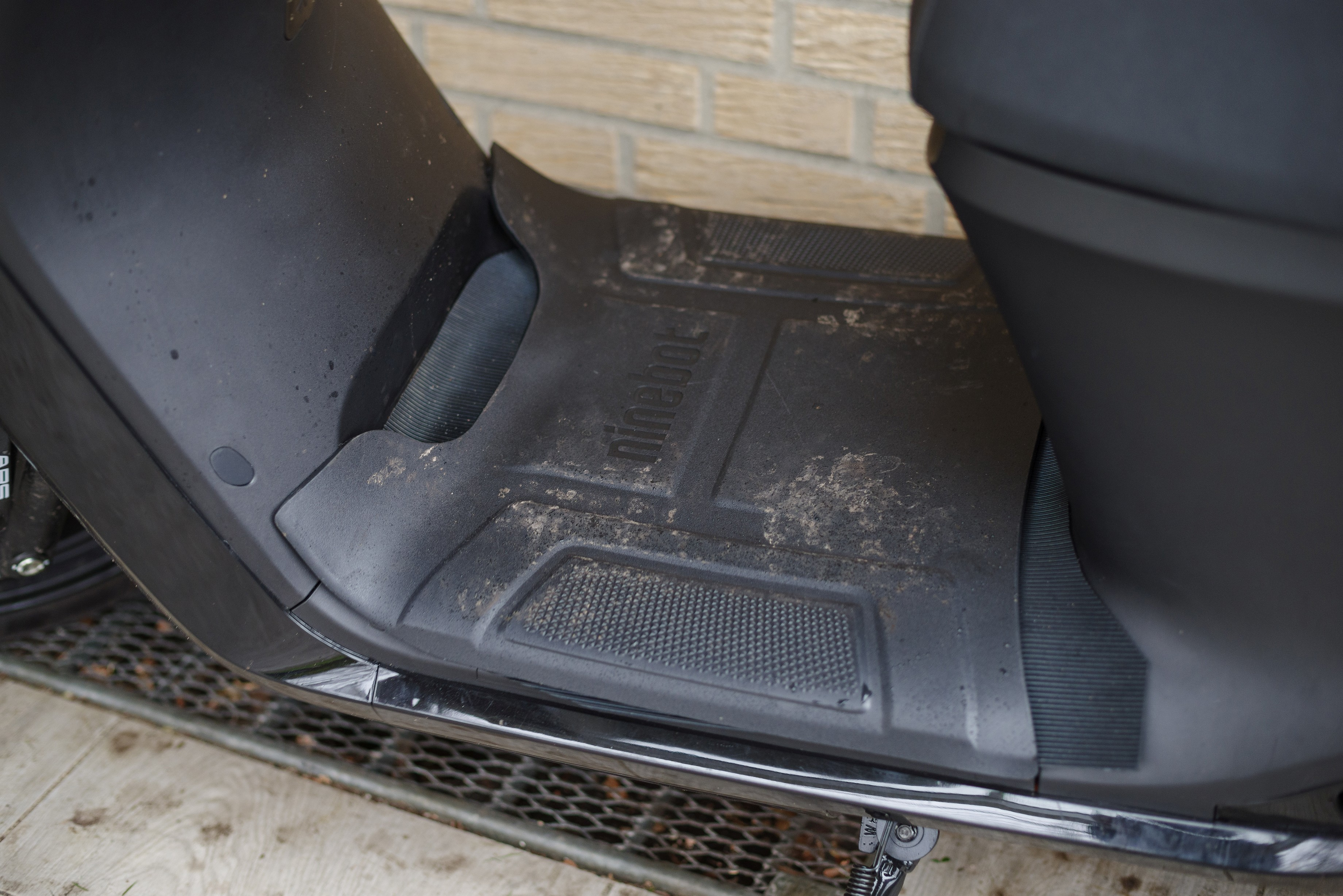 Letztere nehme ich zum Reinigen mit dem Schlauch ab und so geht's recht gut (nur dass die Ninebot Matte den Schmutz gut hält, wie hier gerade nach dem Abspritzen).