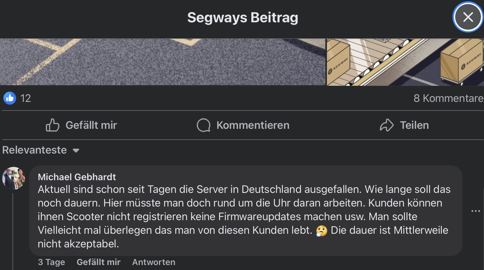 Gerade mal bei Facebook geschaut und über folgendes gestolpert: Es scheint so, dass nicht nur unsere Roller sondern auch e-Scooter von einem Problem mit "Deutschen Servern" betroffen sind.