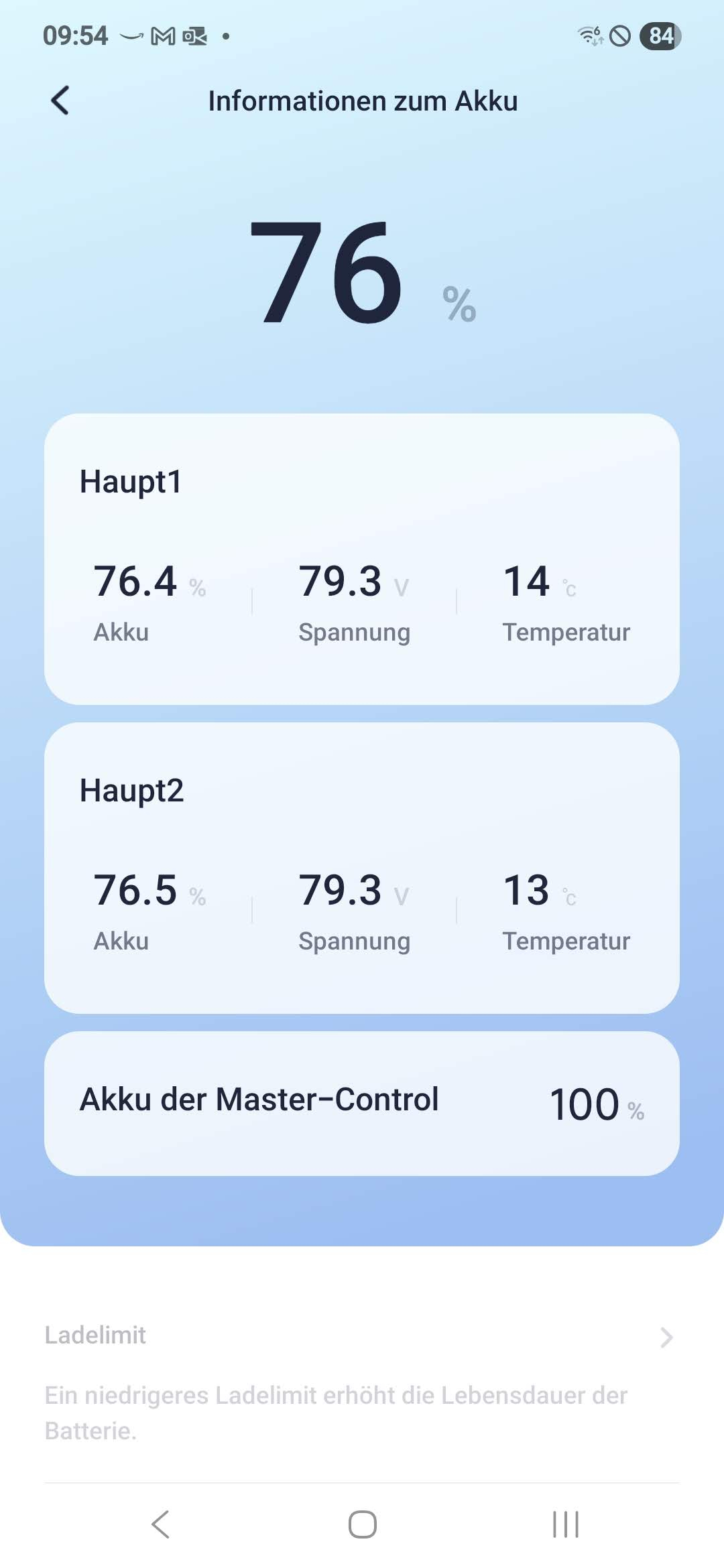 Laut deinem Screenshot ist nur ein Akku angeschlossen: es sollte ein Haupt1 und ein Haupt2 Akku sichtbar sein, darunter der Master-Control, siehe meinen aktuellen Screenshot.