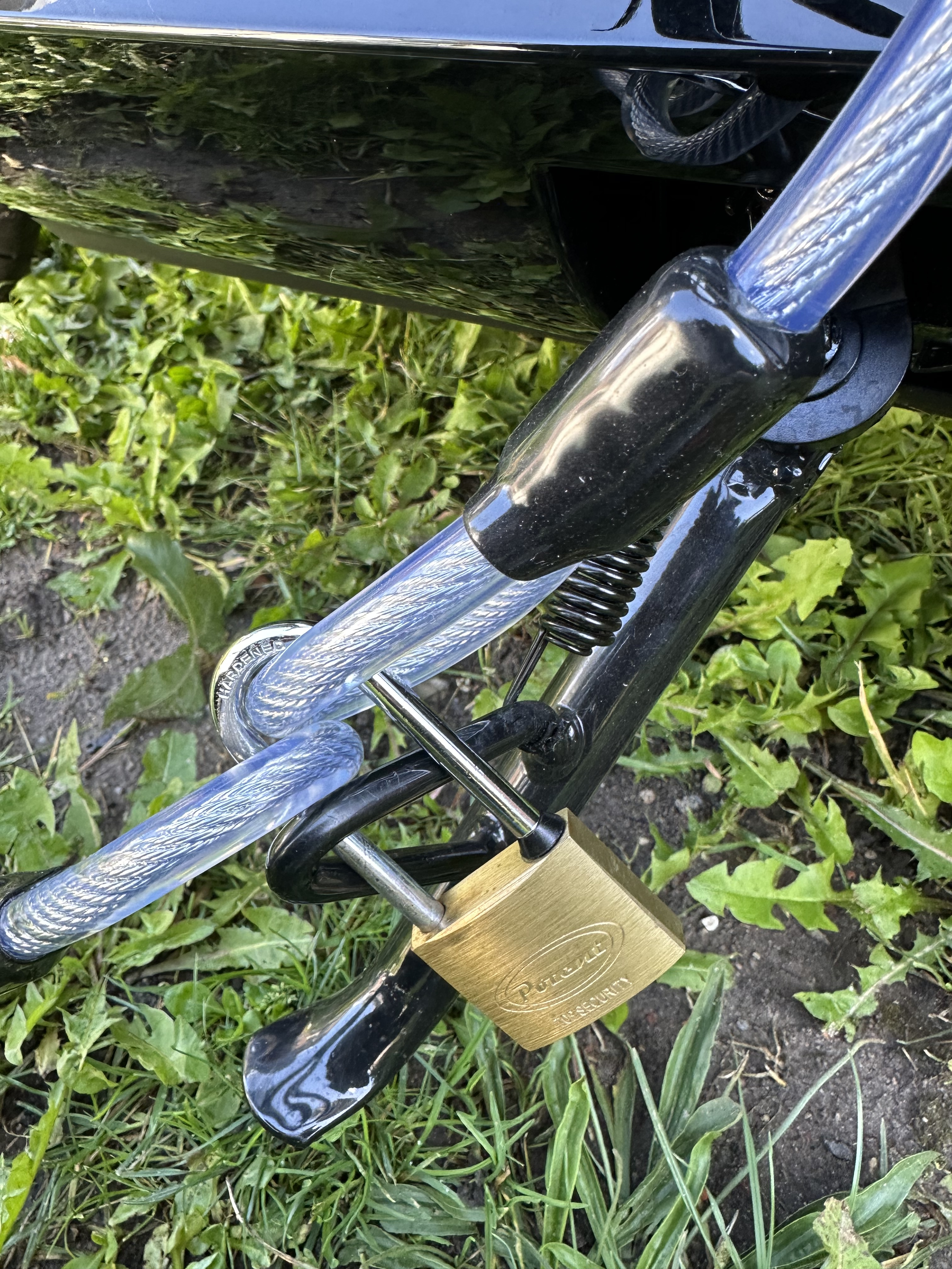 Ich habe an meinem Ladegerät so ein Stahldraht von 'nem Bügelschloss durchgemacht und mit dem Vorhängeschloss gehe ich durch die Öse vom Seitenständer.