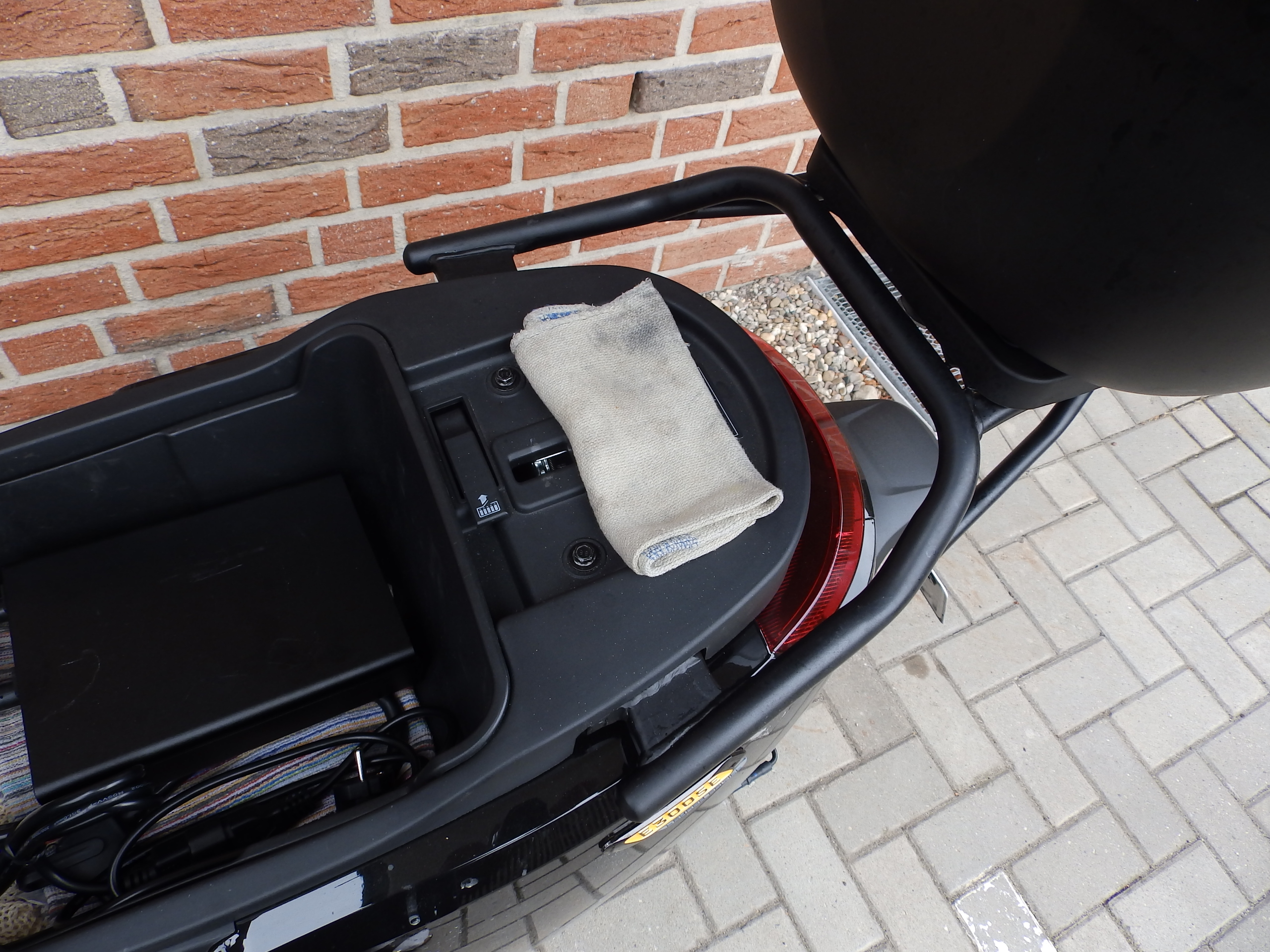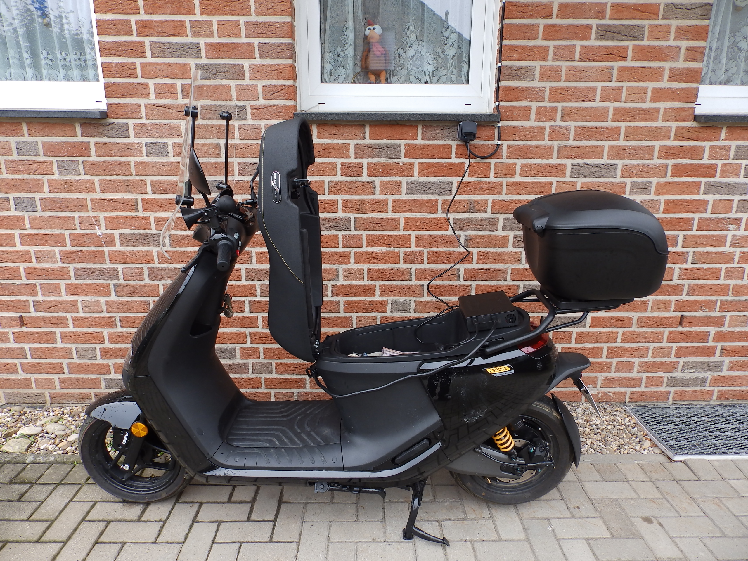 Ich habe außerdem die Halteplatte für das Topcase ziemlich weit nach hinten versetzt. So geht die Sitzbank noch problemlos auf (siehe Fotos mit Ladegerät). Das Topcase soll nur mit max. 6 kg beladen werden, es geht aber auch auf kurzen Strecken mit 12 kg (Getränke einkaufen)... Voraussetzung ist sanftes Beschleunigen und Bremsen (Stufe 1), sonst kann die Halteplatte abbrechen und das Topcase geht flöten :evil: