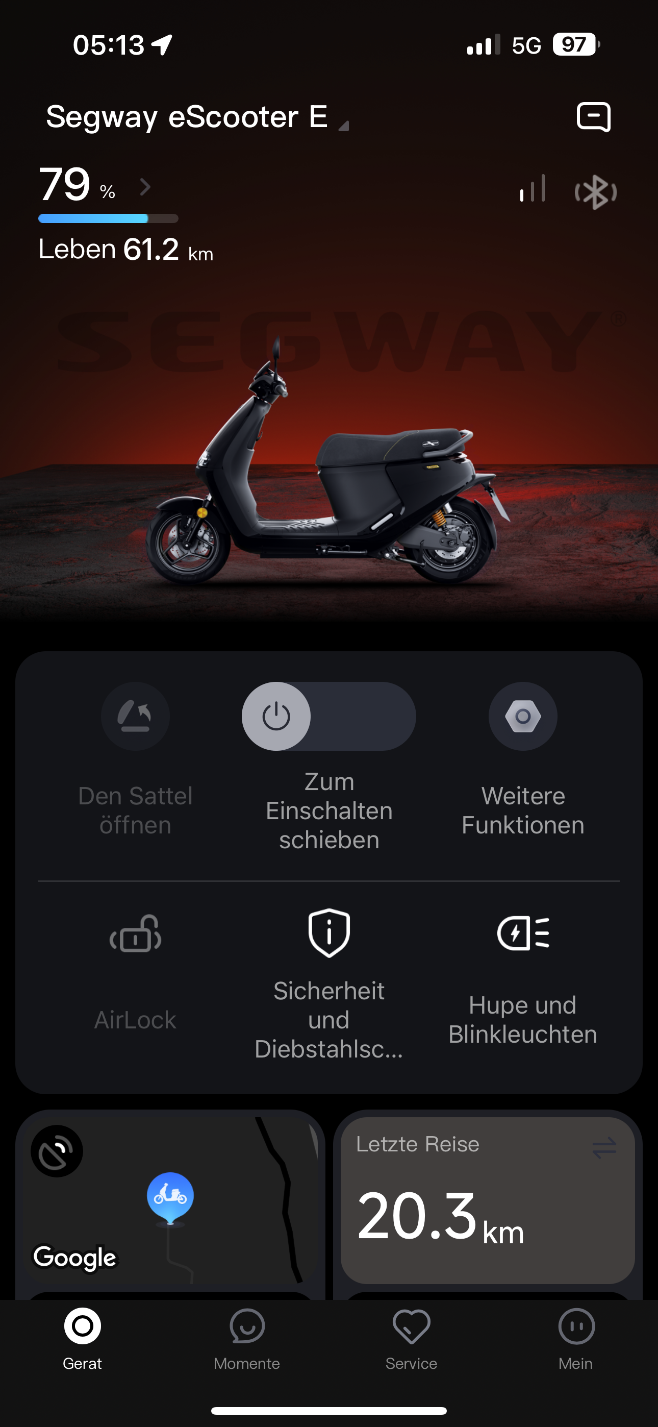 Stimmt, ist bei mir auch der Fall. Hatte ja vorhin geschrieben, dass nach dem abklemmen das Signal kam, habe es aber nicht damit zusammen gebracht. Jetzt ist es wieder weg, Akkus sind wieder angeschlossen. Nervt.MTB hat geschrieben: ↑So 4. Mai 2025, 19:26Das GSM Signal kommt nach ca. 10-20 Minuten nachdem alle Hauptakkus vom Roller getrennt wurden. Die Standortortung ist ab diesem Zeitpunkt wieder aktuell. Sobald die Hauptakkus wieder angeschlossen werden verliert der Roller die Verbindung, das GSM Symbol ist ausgegraut, eine Ortung ist nicht möglich.