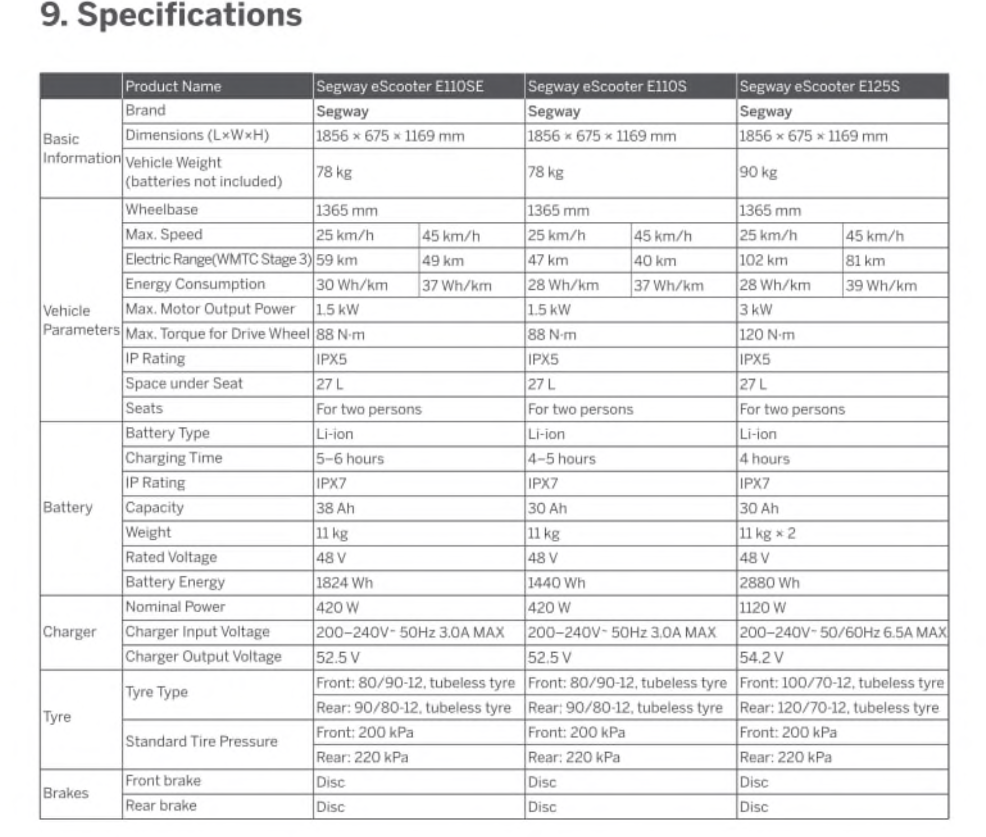 Ich habe mal die Spezifikationen aus dem Handbuch als Screenshot angefertigt. Interessant ist hier, dass dort eine sehr viel realistischere Einschätzung der Reichweite zu den einzelnen Modellen vorgenommen wird.