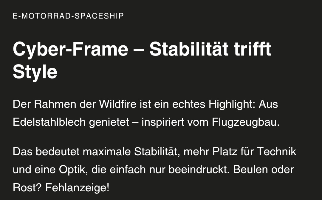Ich wundere mich ein wenig, und habe gedacht, dass die Wildfire nur aus Edelstahl, Aluminium und Kunststoff bestünde. Wozu noch Stahl?