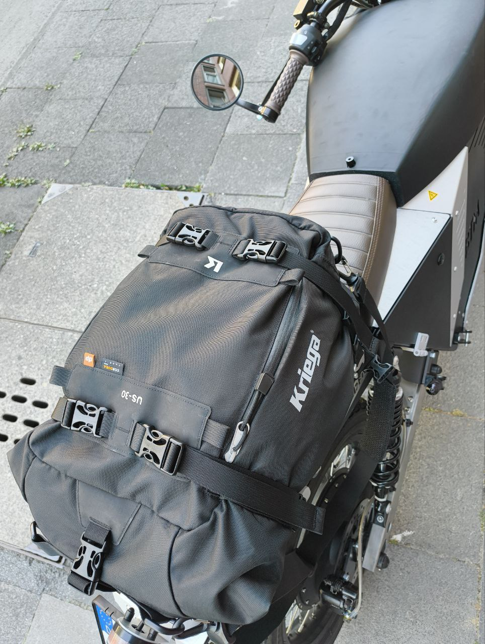 Ich habe hier einen US30 Drybag von Kriega, den man in Sekunden in fest installierte Schlaufen einhaken kann.