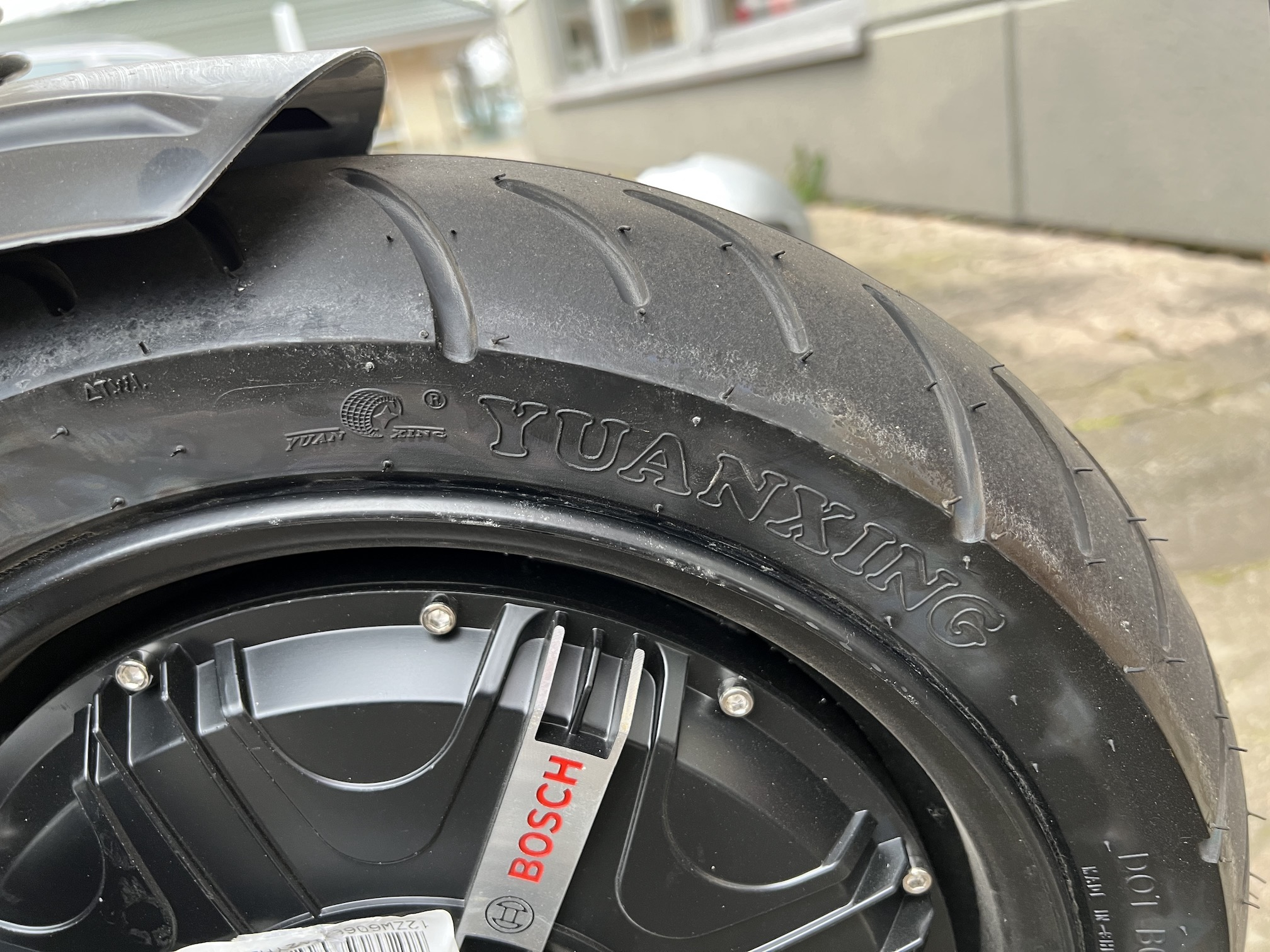 Yuangxing-Reifen, hinten mit einer derart großen Unwucht, dass das ganze Heck bei Vollgas auf dem Hauptständer massiv vibriert.