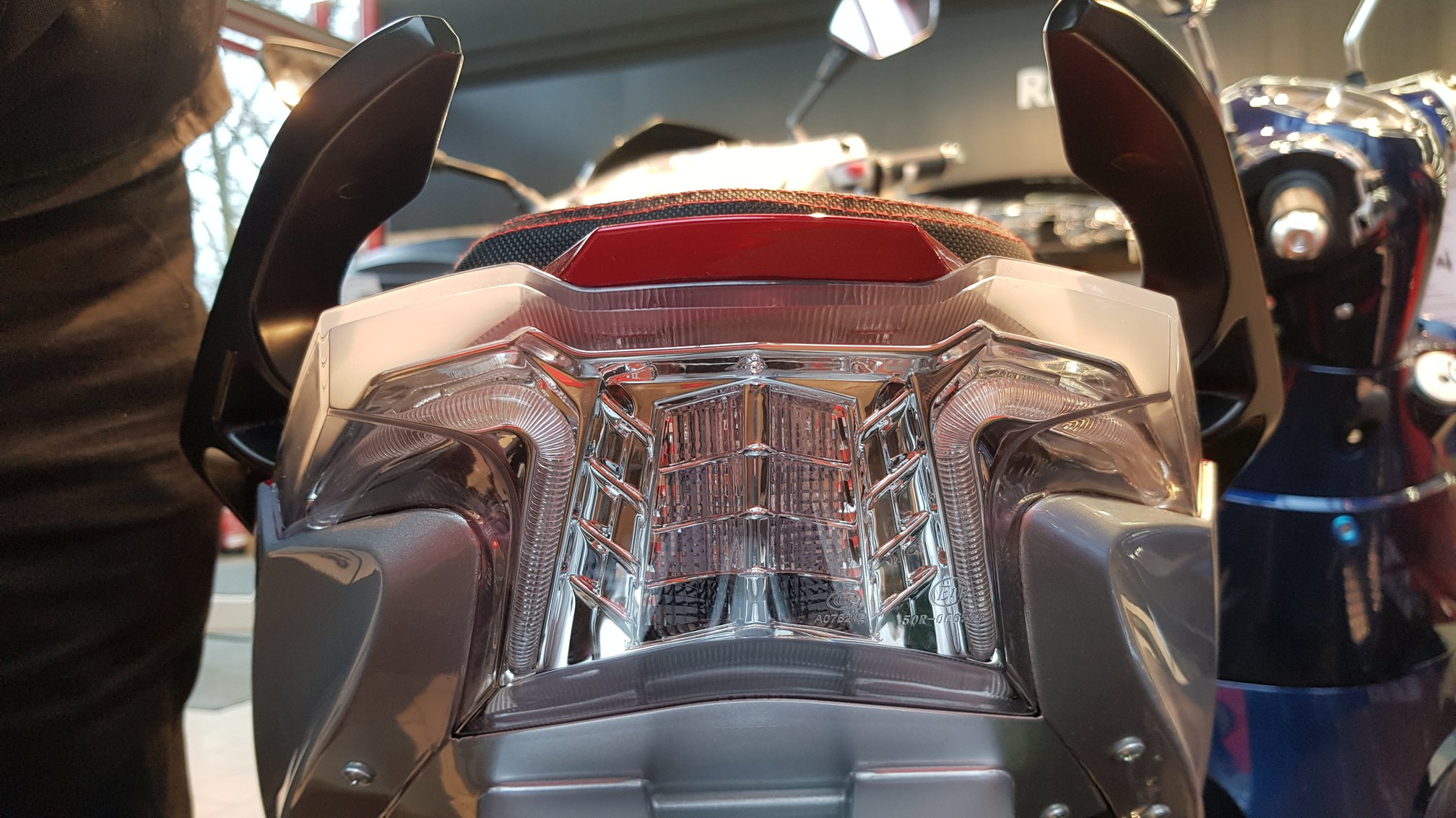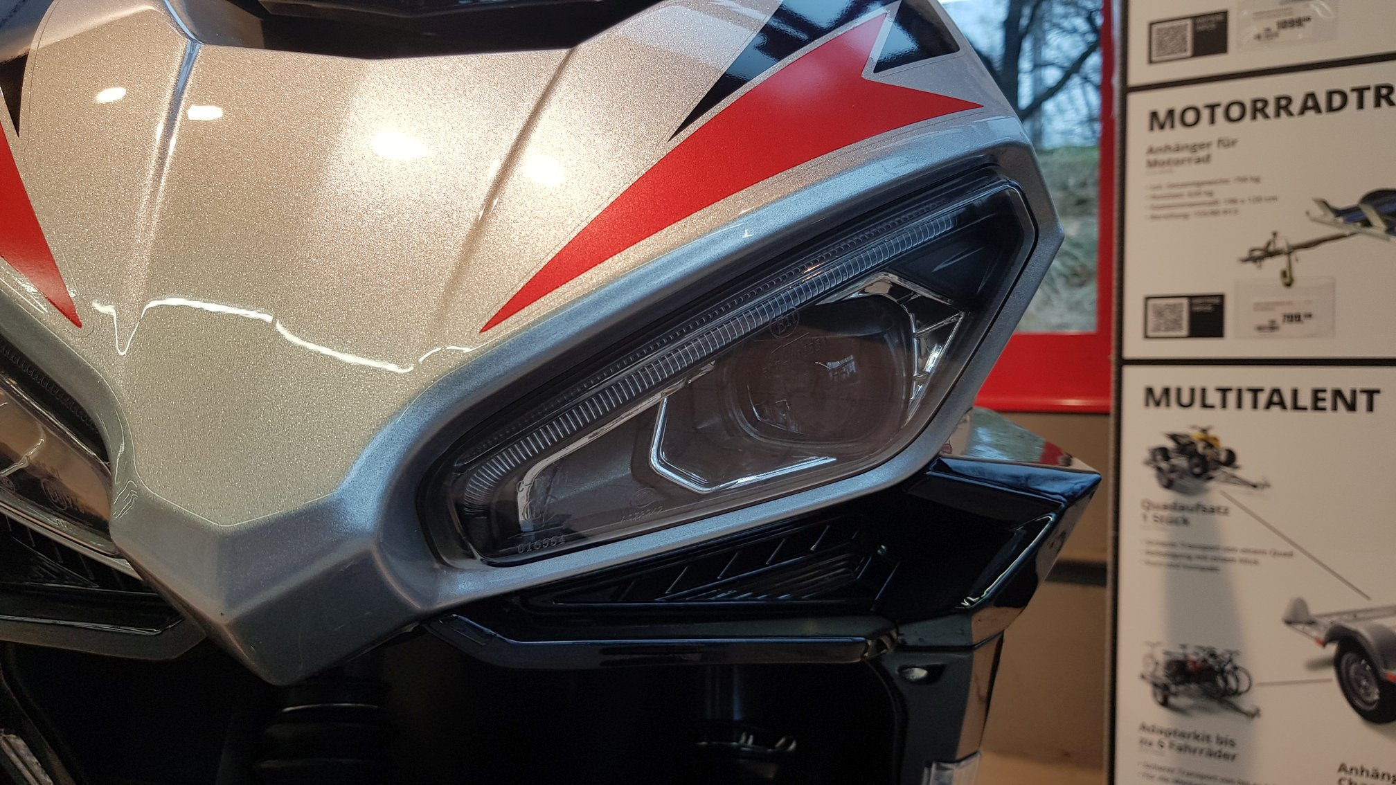 Voll-LED-Beleuchtung (Linsen vorn), die Blinker vorn sind in der Rollerschürze integriert (siehe Seitenansichten), Höhe Oberkante Räder.