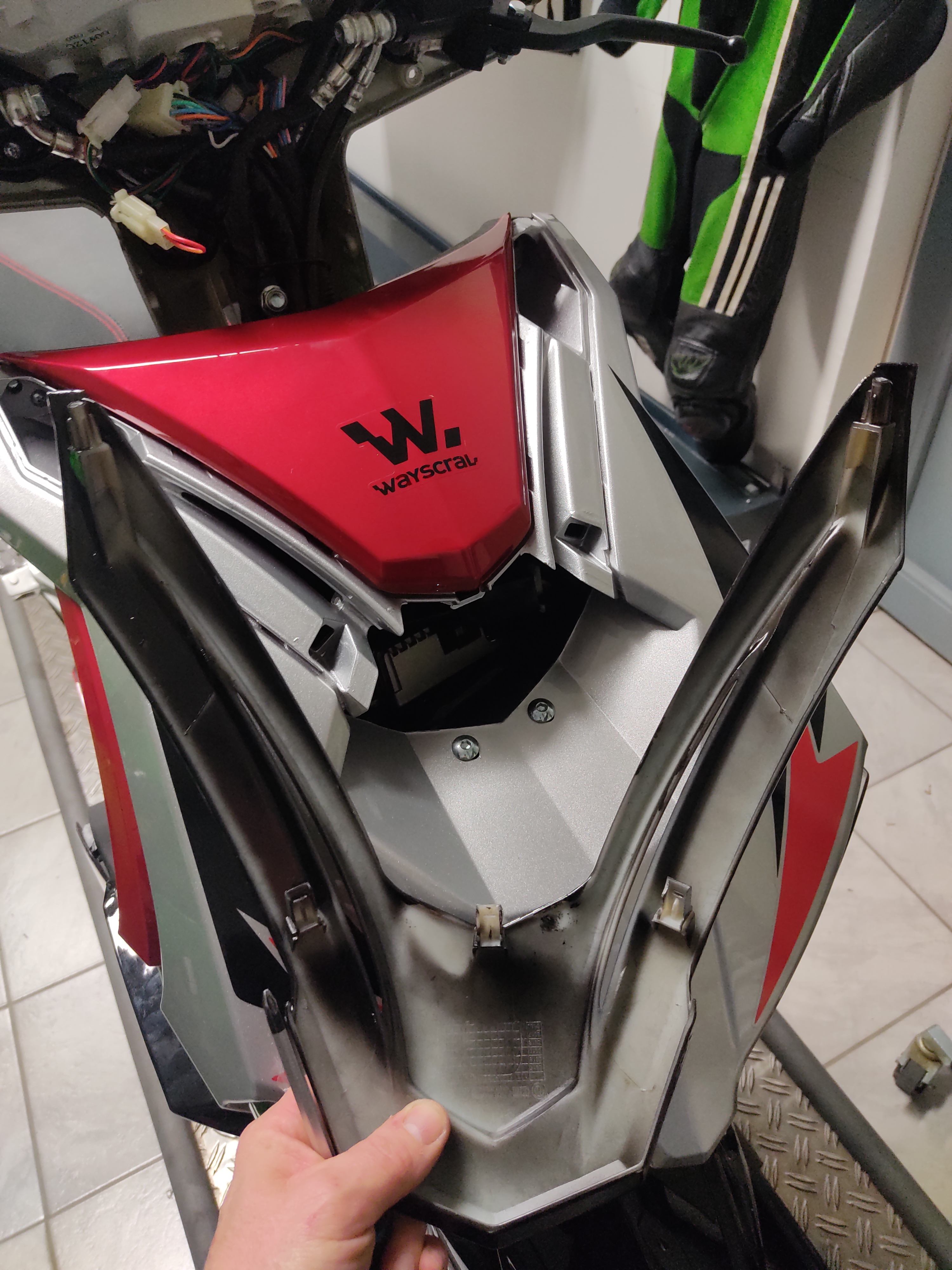 Ja, der Eimer ist Katastrophal verschachtelt. Es gibt 2 Schlüsselstellen mit versteckten Schrauben. Die obere schwarze blende von innen her geschraubt durch das schwarze plastikteil und der angedeutete Lufteinlass unter den Scheinwerfern. Dort ist eine ganz kleine Schraube mit kleinem Kopf angebracht. Den fake Einlass dann mit einer Spitzzange etc. ziehen. Der Rest ergibt sich dann eigentlich. Blinkgeber hab ich ja identifizieren können ist ein rundes Bauteil mit 3 Adern. Ist auch in einem Foto zu sehen. Der Dc-Dc Wandler, Binkgeber/Relais sitzen unter der vorderen Verkleidung. Vom Platz her würde ich sagen mit etwas Modifikation würden da 3x so viel Akkupower hinein gehen. Im jetzigen Zustand wäre das ein optimales Schmuggler Fahrzeug. Da gingen bestimmt 5 Stangen Kippen hinein.