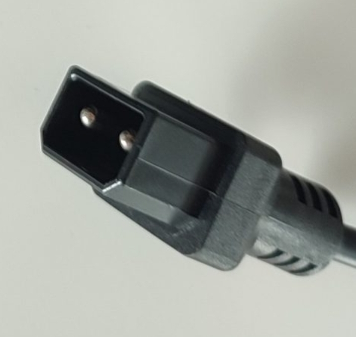 Sieht aus wie ein Kaltgeräte Stecker allerdings nur 2 Runde Anschlüsse.