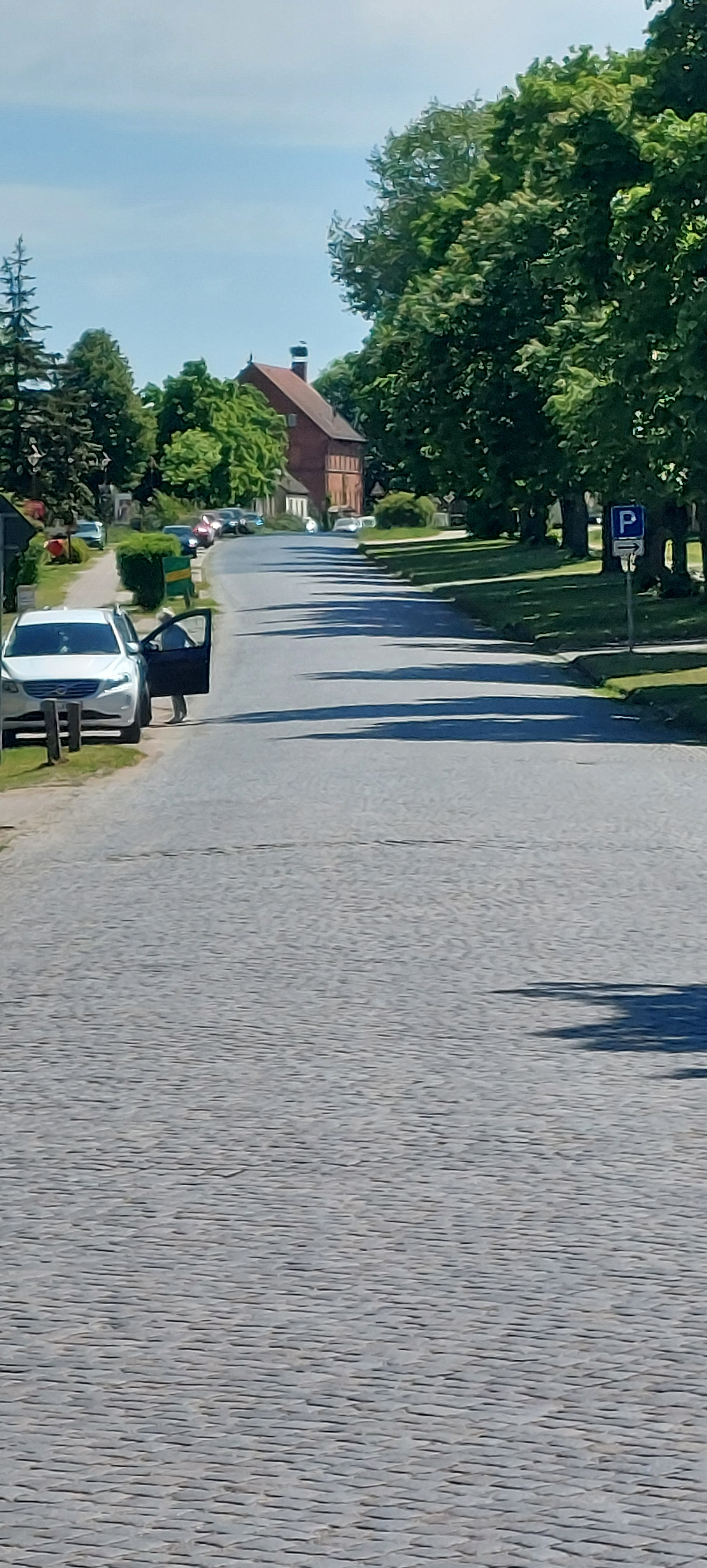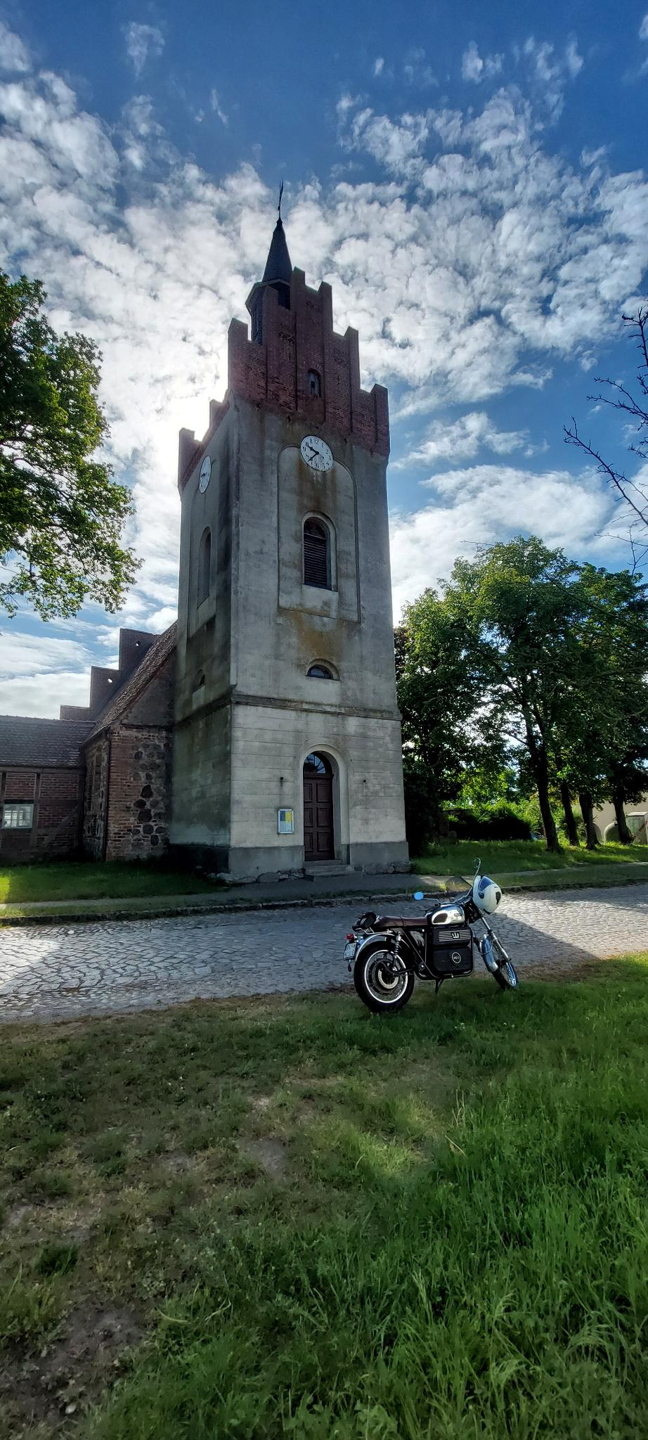 Hier vor der Kirche in Dechtow. Wikipedia weiß zu berichten, dass Dechtow für seine Kopfsteinpflasterstraße berühmt ist. Man hätte erwähnen können, dass auch die Landstraßen eine Herausforderung an das Fahrwerk sind.