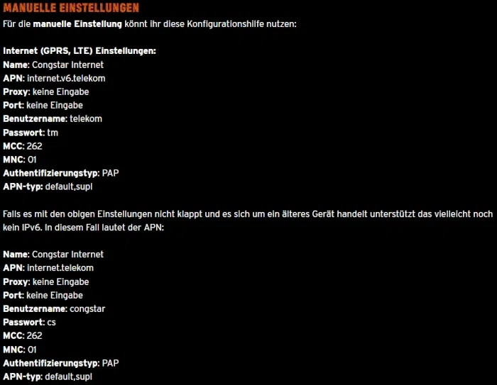 Wenn ich es recht sehe ist Congstar ein Reseller und verwendet im D1-Netz die Telekom. Von daher würde ich internet.home für richtig halten. Ein Problem könnte bei Dir auch "v6" sein - das ist wohl der Zugangspunkt für ipv6, ich wäre aber der Meinung, dass die RGNT nur ipv4 spricht und auch nur im Systemmenü ipv4-Adressen anzeigt.