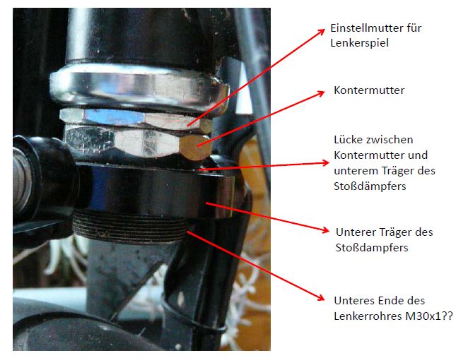 Das könnt ihr anhand des Bildes unten sehen. Beide Muttern hatte ich gelöst und ein paar Umdrehungen nach oben geschraubt, dann wieder fixiert. Dadurch ist zwischen der Kontermutter und dem unteren Stoßdämpferträger (den nenn ich mal so) eine kleine Lücke entstanden. Es zeigt sich das das Lenkerrohr, welches ja durch den unteren Stoßdämpferträger geht, auch Spiel hat und sich im Trägerloch hin und her bewegen kann, dadurch läßt sich der Lenker ebenfalls mit Spiel bewegen, gleicher Effekt wie beim Spiel mit den Muttern. Was kann man denn jetzt dagegen tun? Ich habe mir überlegt eine dritte Mutter von unten auf das freie Lenkerrohrende zu schrauben und dadurch den Stoßträgerdämpfer von unten zu fixieren. Was meint ihr dazu? Hatte jemand schonmal ein gleiches Problem? Ich habe heute zwei Flachmuttern DIN936 M30x1.5 und M30x2.0 versucht, haben beide aber nicht gepasst, vermute mal ist noch feineres Gewinde wahrscheilich M30x1.0, weiß es jemand zufällig?.
