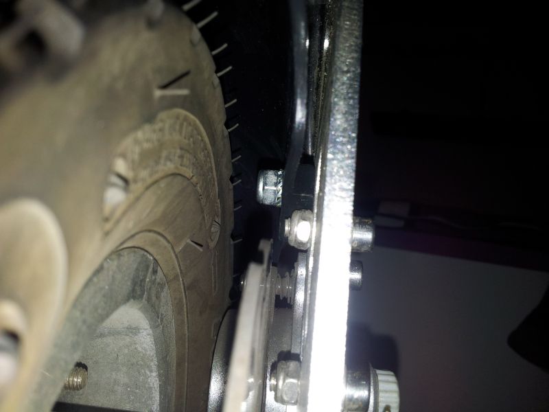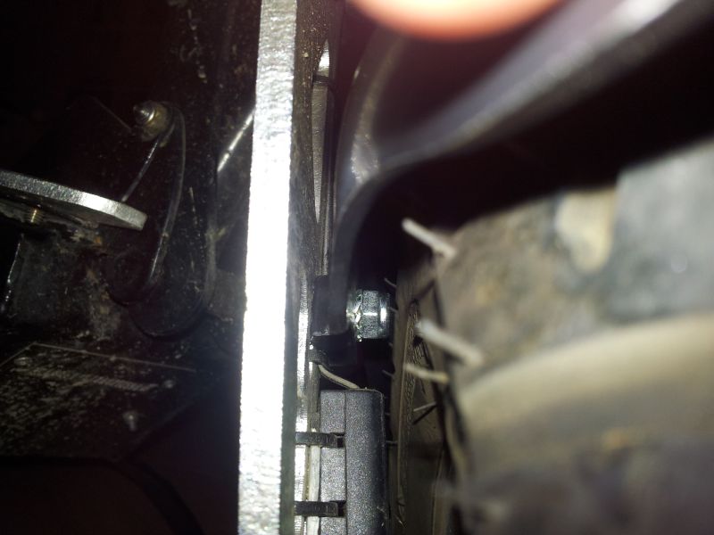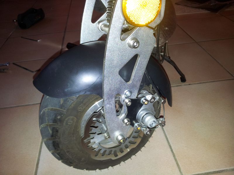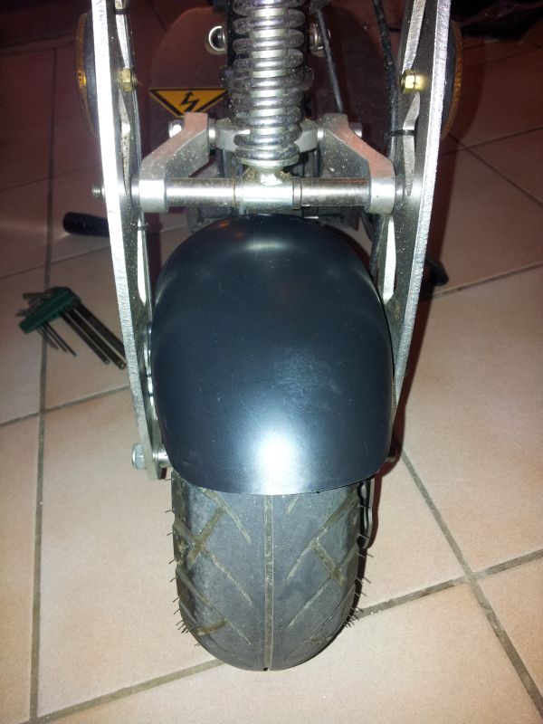 Warum die Fächerscheiben: Das Schutzblech ist ansich sehr stabil aber es wird nur rechts und links von einer Schraube gehalten. Somit hat man einen Drehpunkt. Durch Vibrationen können Sie die Teile lockern und sich das Schutzblech in diesem Falle bewegen und den Reifen blockieren. Ich will mir nicht ausmalen was dann alles passieren könnte. Deshalb habe ich die Fächerscheiben zwischen der Mutter und dem Schutzblech gelegt. (war etwas Friemelei, Tipp: das kann man umgehen wenn man die Fächerscheiben mit nen Tropfen Sekundenkleber innen an den Spritzschutz klebt) und anschliessend die Mutter festgezogen. Der Effekt: Die Fächerscheiben schneiden in den Kunsstoff und fixieren diesen zusätzlich. Ein Lösen der Teile sollte somit minimiert werden.