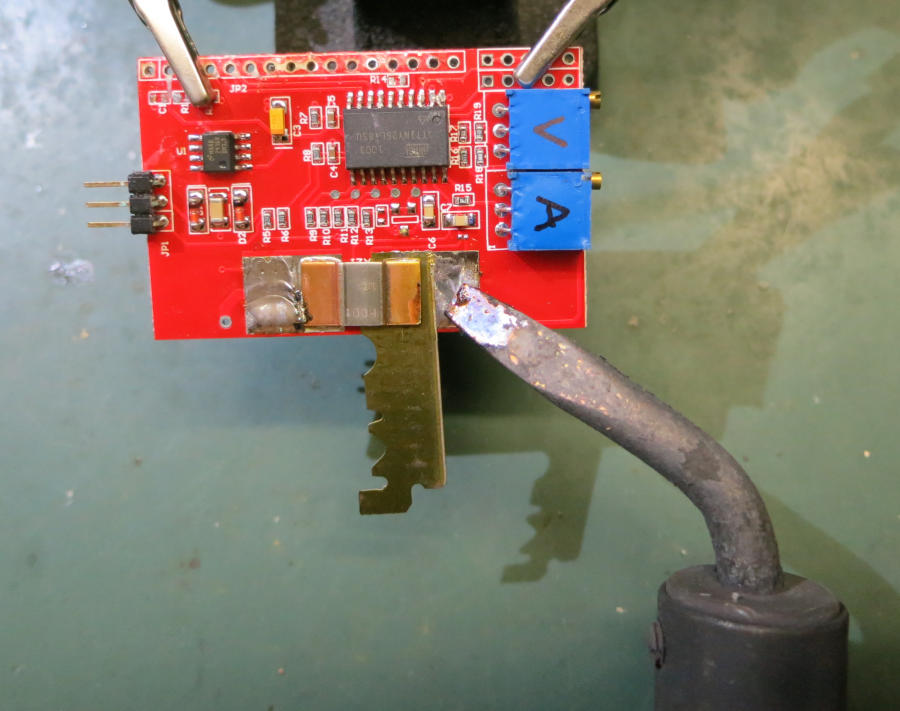 Für das Auslöten des Shunts braucht man einen größeren Lötkolben, um das Lötzinn schnell verflüssigen zu können. Dadurch kann sich die Hitze auf der Platine nicht so ausbreiten und die Halbleiter zerstören. Als erstes werden die dicken Plus- und Minuskabel abgelötet. Da man selten 2 Lötkolben gleichzeitig einsetzen kann, muss man erst eine Seite des Shunts mit einer Rasierklinge loslöten.