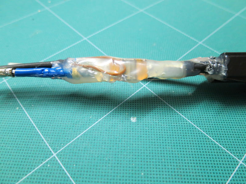 Das Minuskabel mit dem Shunt gegen Feuchtigkeit mit Heißkleber umschließen und darüber einen Schrumpfschlauch.