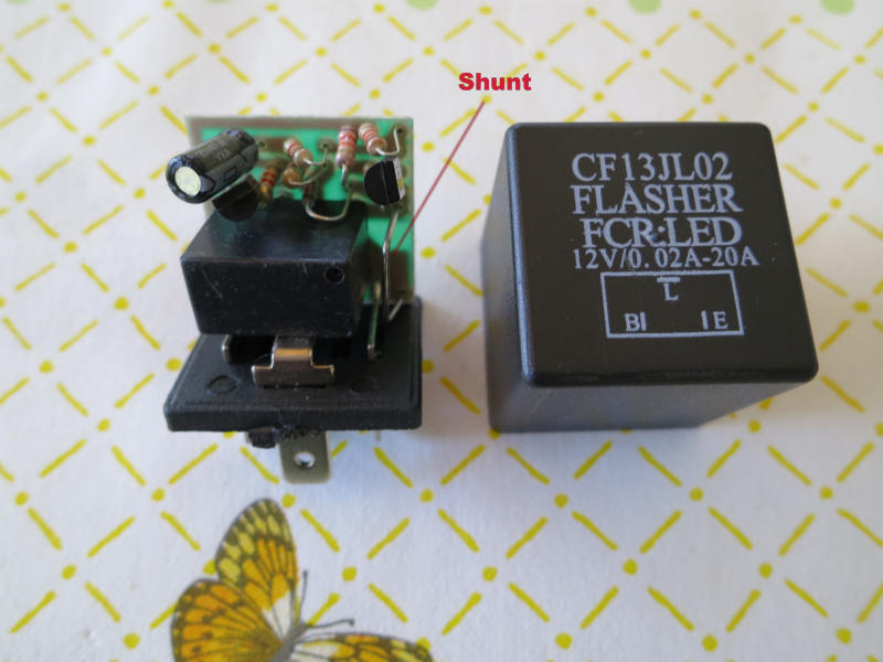 Jetzt muss ich das Blinkrelais an die LED anpassen. Die Drahtbrücke auf der Platine ist wohl ein Shunt, dessen Widerstand ich erhöhen muss. Mal sehen, ob mir das gelingt.
