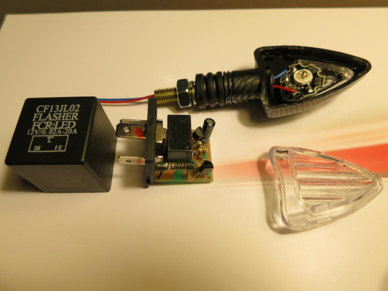 unerwartet hat sich eine erste Hürde aufgetan. Das Blinkrelais blinkt mit LED viel zu schnell. Erst ab 20 W Leistungsverbrauch blinkt es mit den vorgeschriebenen 1,5 Hz. Da ich nur auf 5 W komme, blinkt es schneller, da die Schaltung glaub eine Glühbirne ist ausgefallen. Ja, so ist nun mal die Vorschrift laut STVO.