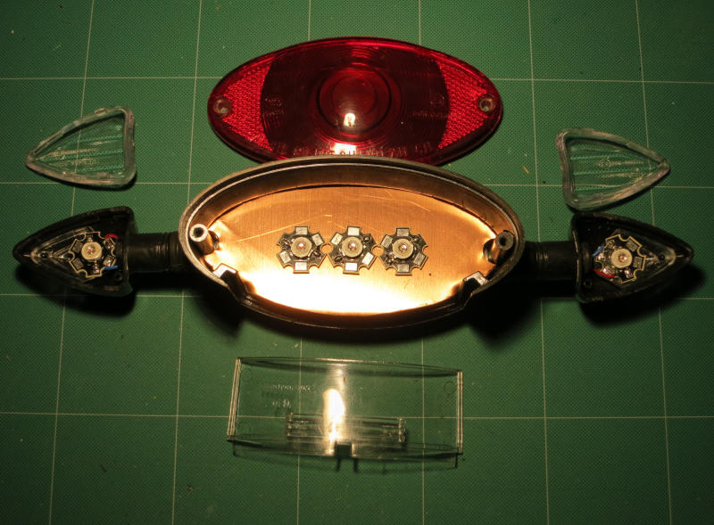 bei meinem Rücklicht habe ich an beiden Seiten die Blinklichter angeschraubt und mit gelben Power-LED's bestückt.