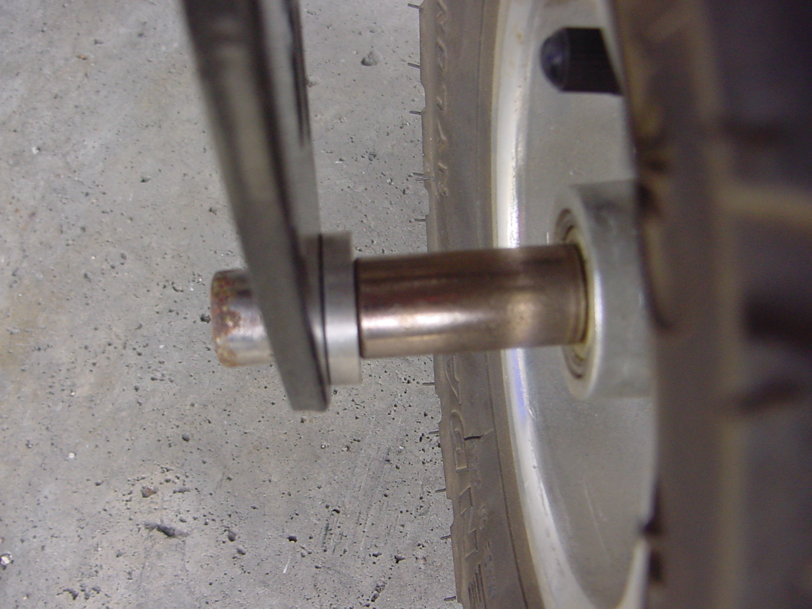 Ich habe es als wichtig empfunden, nicht die etwas zu weit nach außen abstehenden Gabelenden einfach zusammenzuspannen, sondern habe die Abstandshülsen des Vorderrads links und rechts mit passenden U-Scheiben aufgefüttert, so dass der Reifen zentral unterm Lenkrohr steht. Rechts was dickeres: Links was dünnes: 16. Controller-Trennblech und Batterie wieder im Batteriekasten deponieren