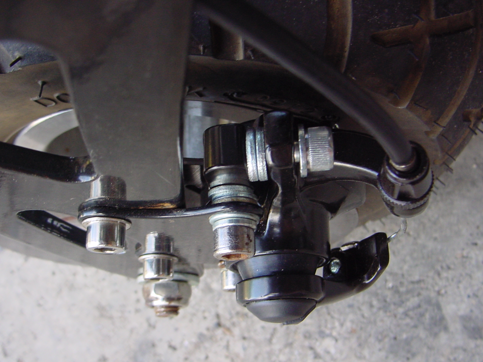 15. Ob man zuerst das Vorderrad und dann den Bremssattel (dann kriegt man das Vorderrad besser rein, kommt aber schlechter and die Bremssattel-Muttern ran) oder in umgekehrter Reihenfolge montiert ist Geschmacksache. Bremszüge wieder mit Kabelbindern an Vordergabel bzw. für hinten am Kabelbaum befestigen.