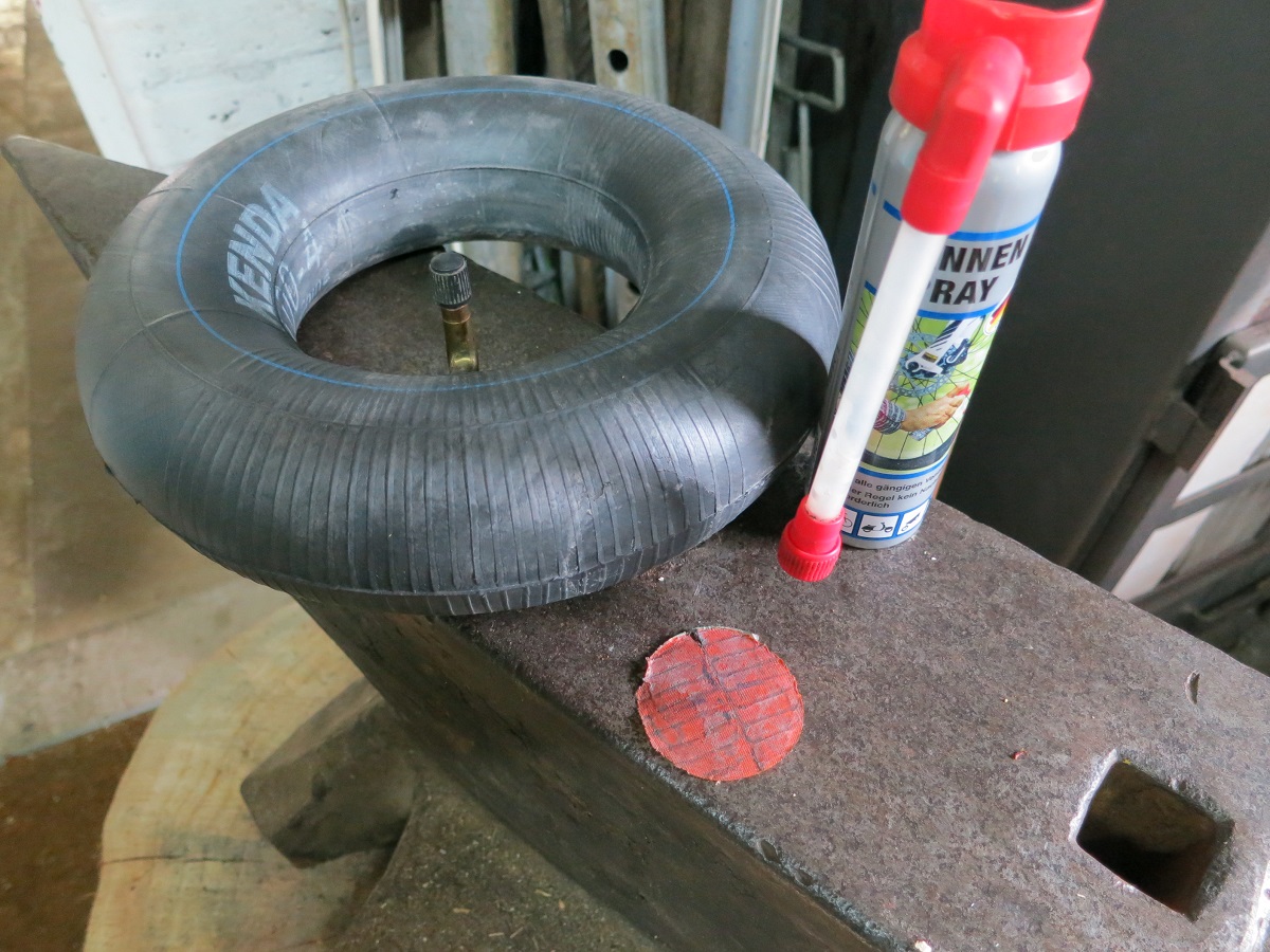 Am nächsten Tag mach ich mich an die Reparatur. An den Schlauch kommt man nur heran, wen man die beiden Hälften der Felge aufschraubt. Der Schlauch hat leider keine glatte Oberfläche und der Flicken schließt nicht dicht ab. Am nächsten Tag ist der Druck um die Hälfte gesunken.