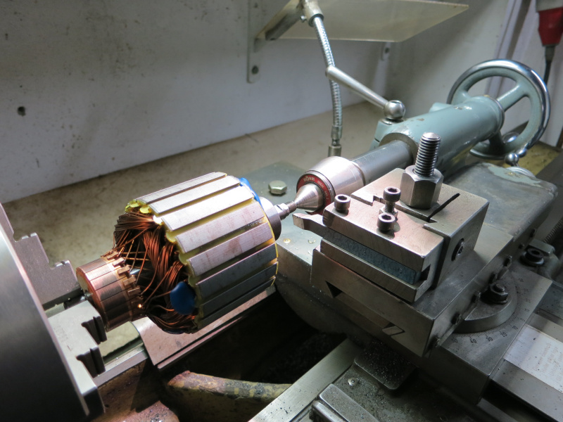 Die schwierigste Aufgabe war erst mal das Kugellager von der Achse zu ziehen, um den Rotor in die Drehbank einspannen zu können. Das stufige abdrehen der Achse ging gut. Die Bohrung quer durch die Achse war schon schwieriger, da es gehärteter Stahl war.