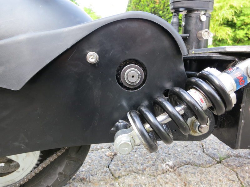 Nachdem wieder alles zusammengebaut war, sogar die Kette war noch lang genug, und der Akku angeschlossen war, kam die Probefahrt. Der Motor schnurrte los, nur der eScooter bewegte sich nicht, da der Freilauf zum Einsatz kam.