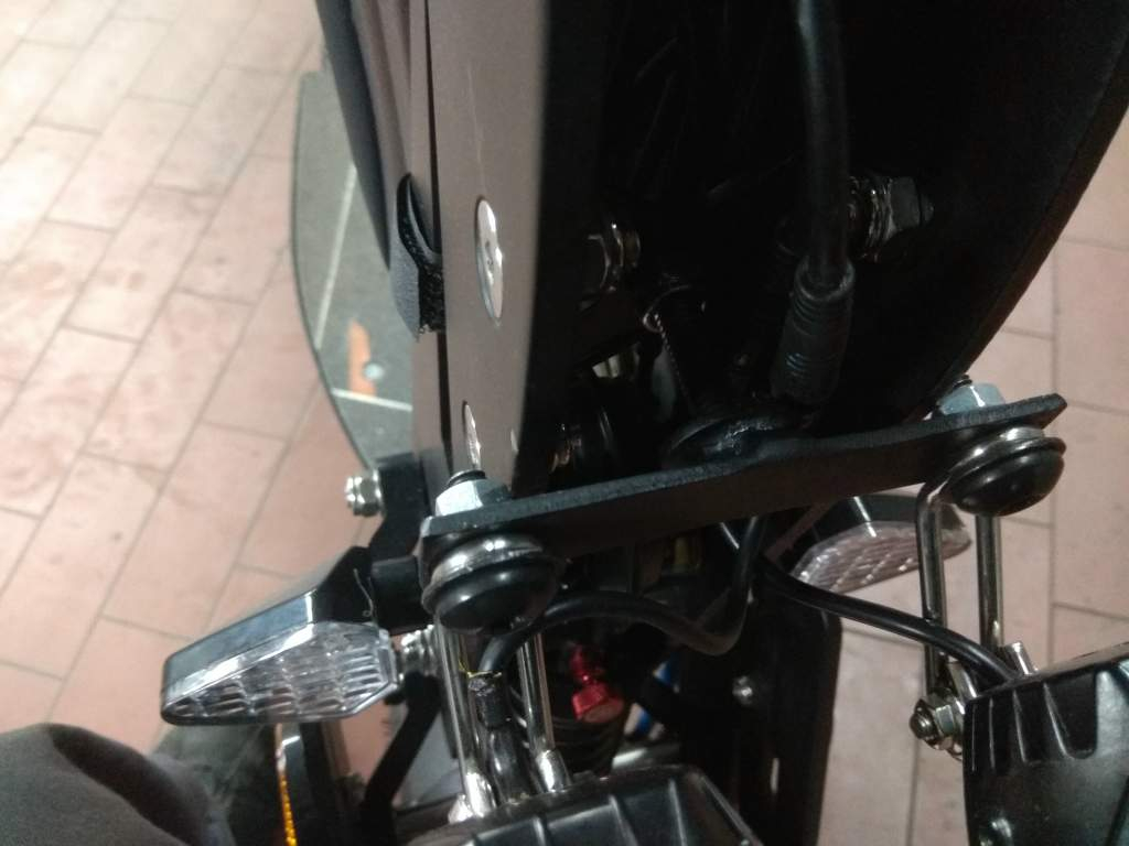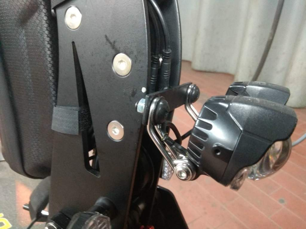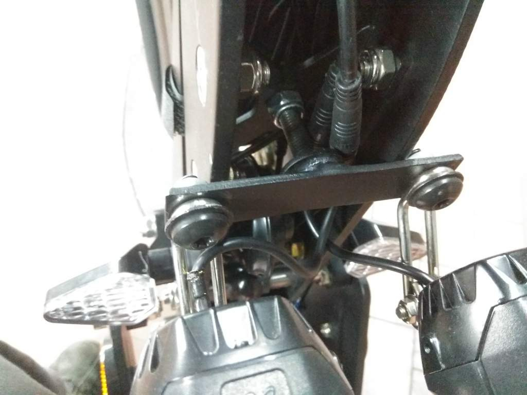 ich hab einfach ein stück flacheisen was ich auf arbeit noch rumzuoxidieren hatte genommen und auf passende länge geschnitten, an die enden zwei löcher gebohrt wo ich die lampen anschrauben kann. dann mittig eine passend lange schraube geschweißt. um das ganze in das originale loch im scooter zu stecken und dann das ganze nur mit zwei muttern festgeschraubt. die eine mutter als anschlag und die andere zum festschrauben. das ganze noch schwarz lackiert und fertig. ich mach dir mal noch eine nahaufnahme